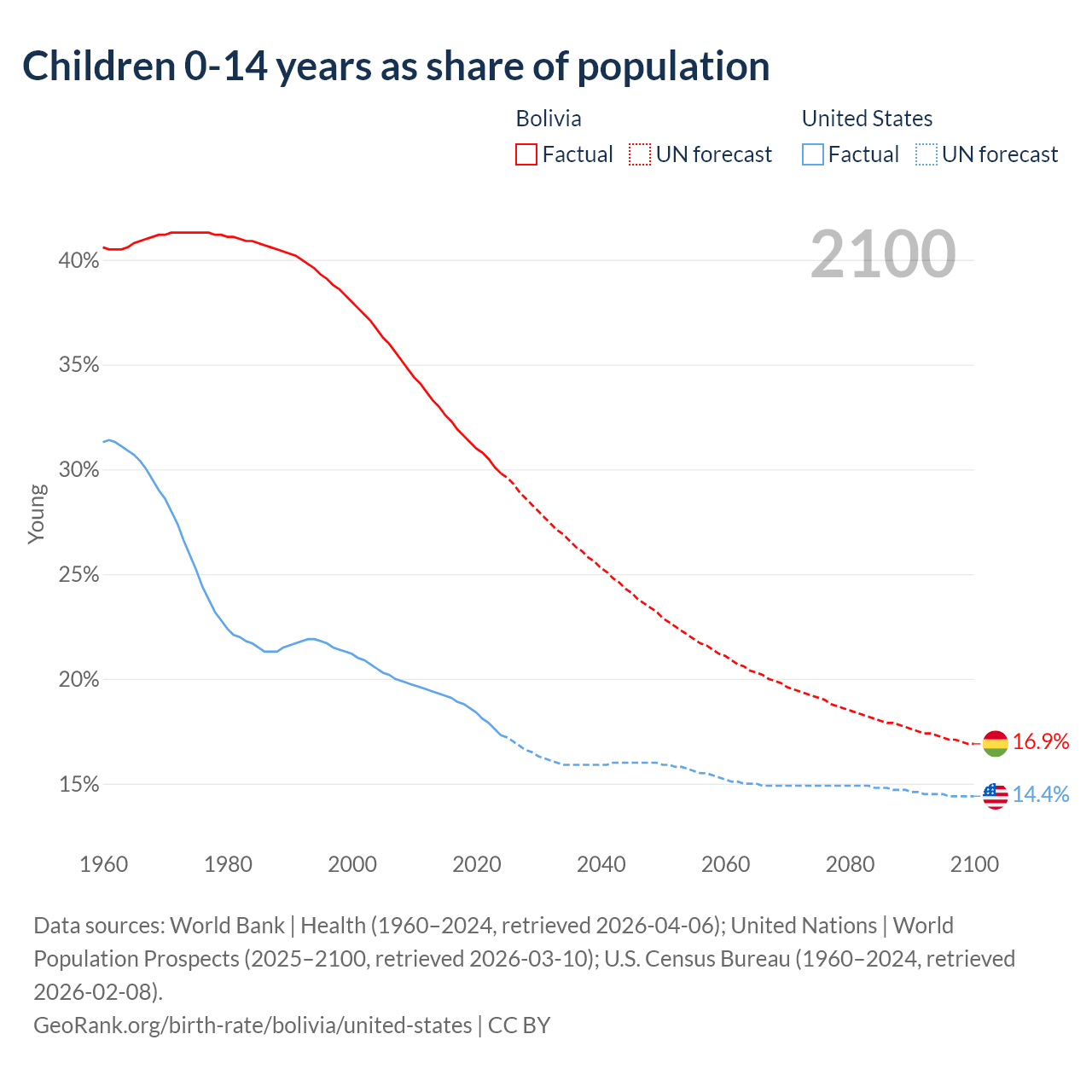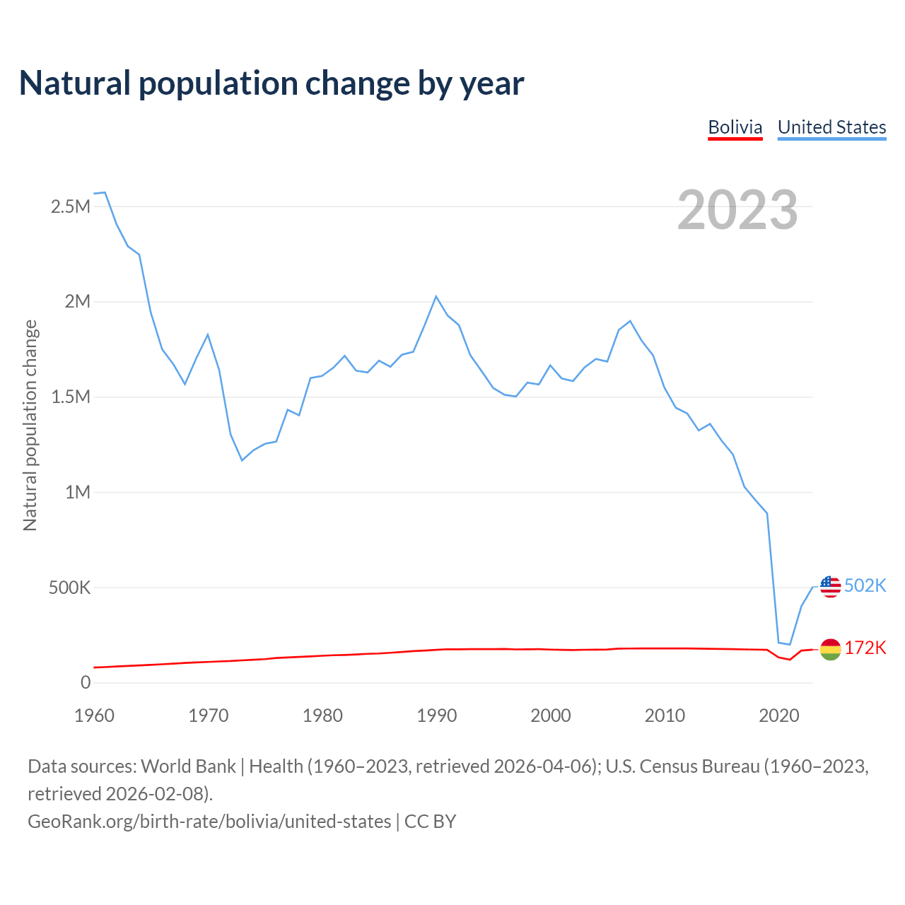 According to the latest available data on birth rates, the fertility rate in Bolivia was 2.55 children per woman in 2023, compared to 1.62 in the United States in 2023. The replacement level is considered to be 2.1 children per woman.