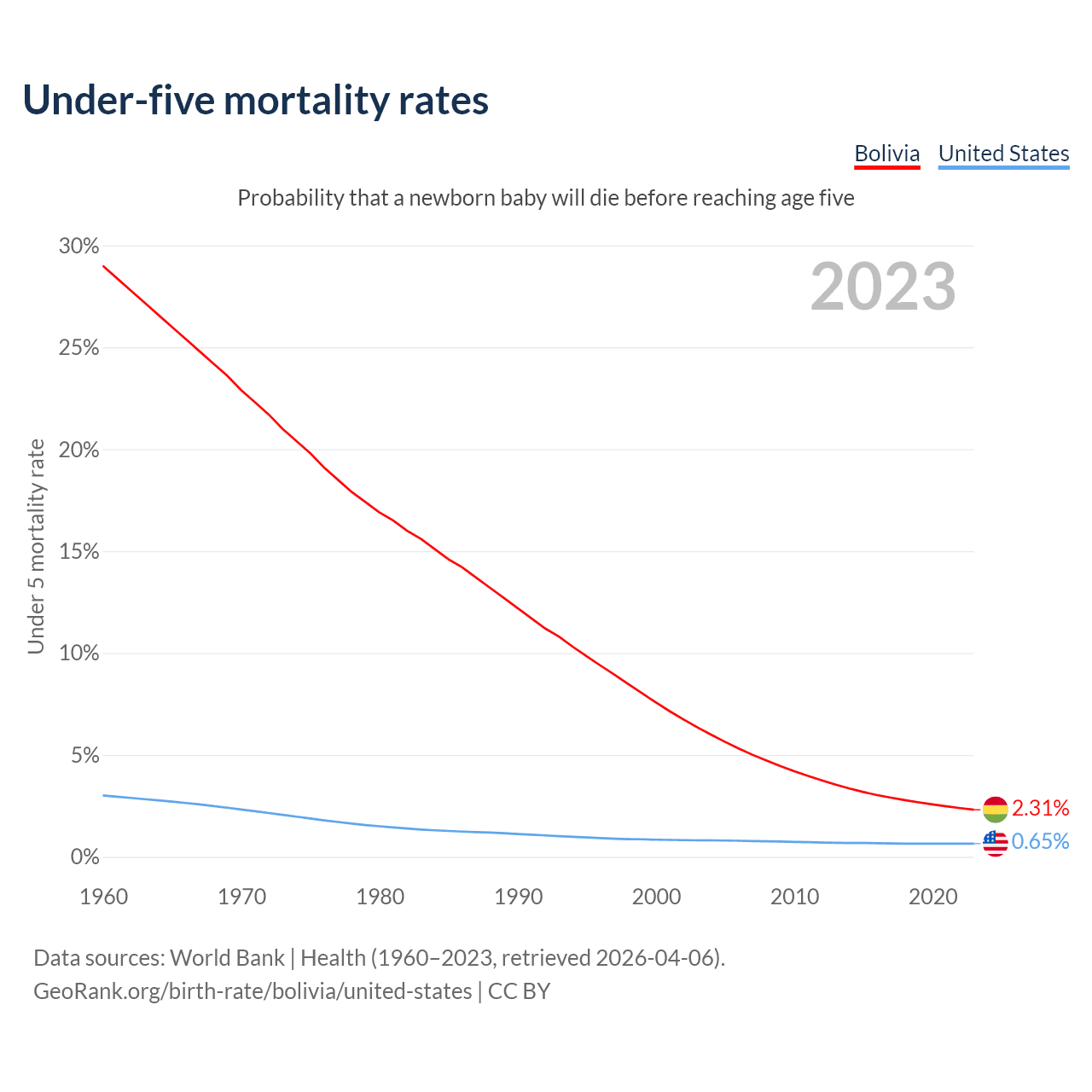 The chance that a newborn baby will die before reaching age five is 2.31% in Bolivia and 0.65% in the United States. Above is a chart with historical data on under-five mortality rates.