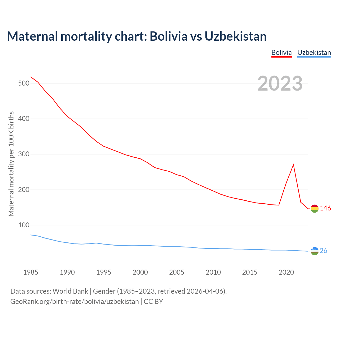 The maternal mortality rate, which is the probability of dying during childbirth or within 42 days of pregnancy termination, is 146 deaths per 100,000 live births in Bolivia, compared to 26 deaths in Uzbekistan.