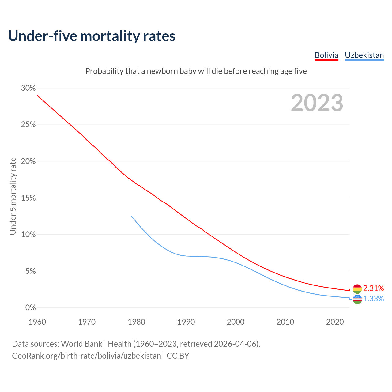 The chance that a newborn baby will die before reaching age five is 2.31% in Bolivia and 1.33% in Uzbekistan. Above is a chart with historical data on under-five mortality rates.