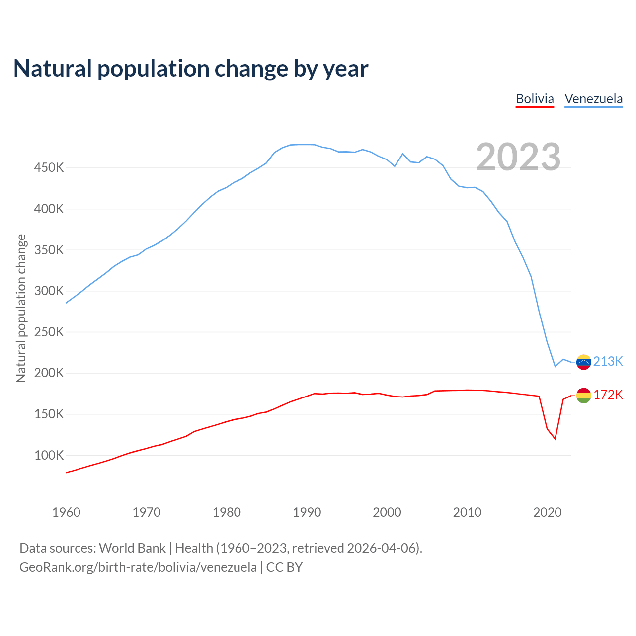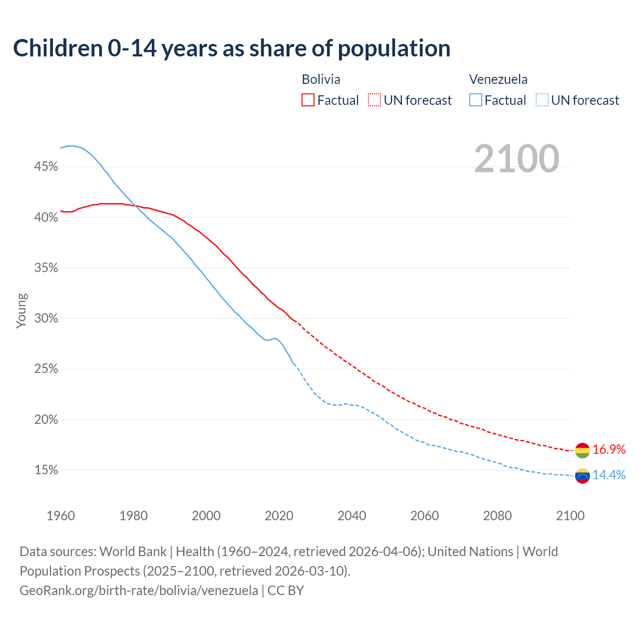 According to the latest available data on birth rates, the fertility rate in Bolivia was 2.55 children per woman in 2023, compared to 2.08 in Venezuela in 2023. The replacement level is considered to be 2.1 children per woman.