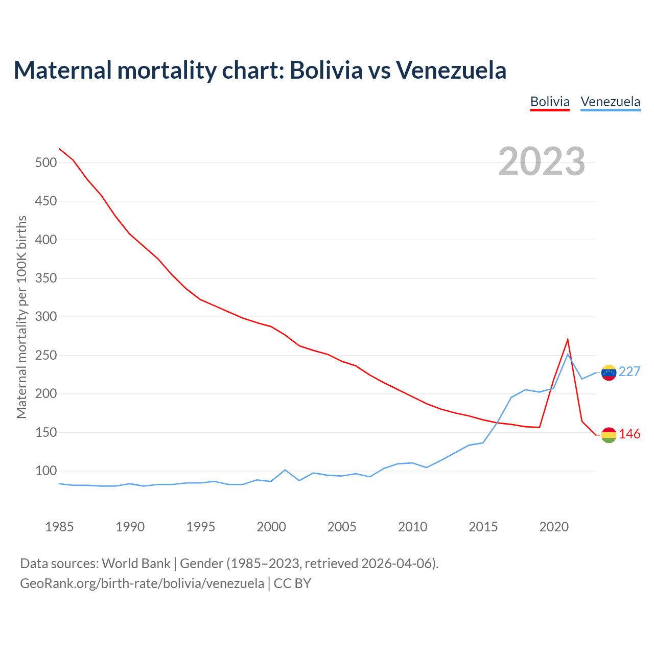 The maternal mortality rate, which is the probability of dying during childbirth or within 42 days of pregnancy termination, is 146 deaths per 100,000 live births in Bolivia, compared to 227 deaths in Venezuela.