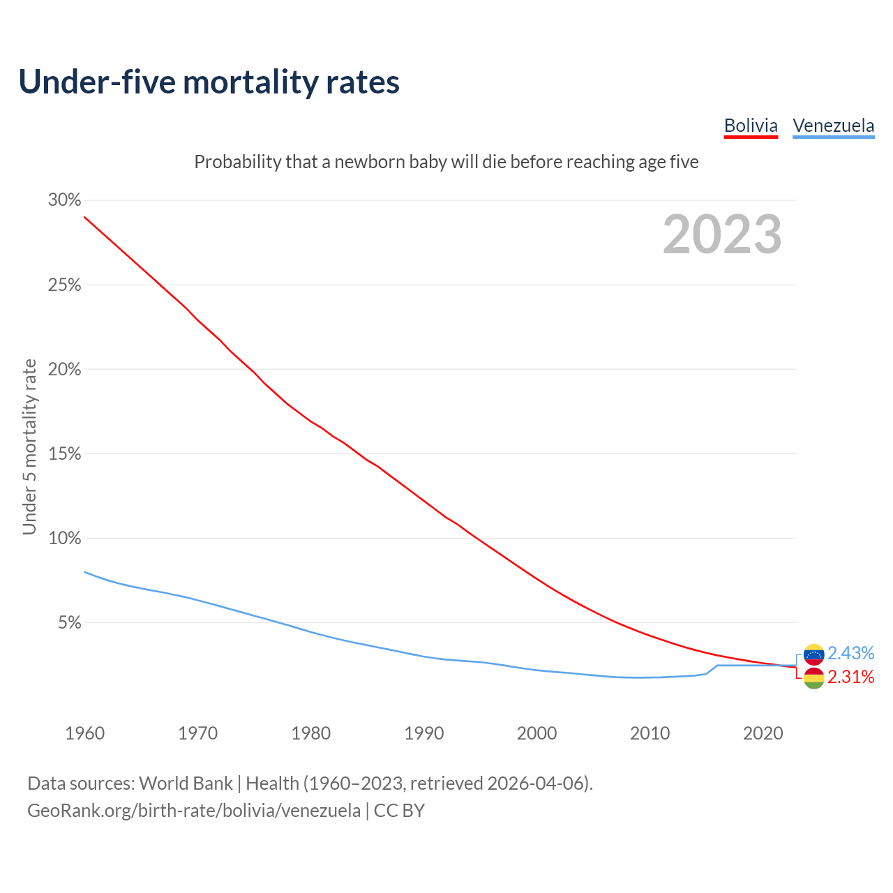 The chance that a newborn baby will die before reaching age five is 2.31% in Bolivia and 2.43% in Venezuela. Above is a chart with historical data on under-five mortality rates.