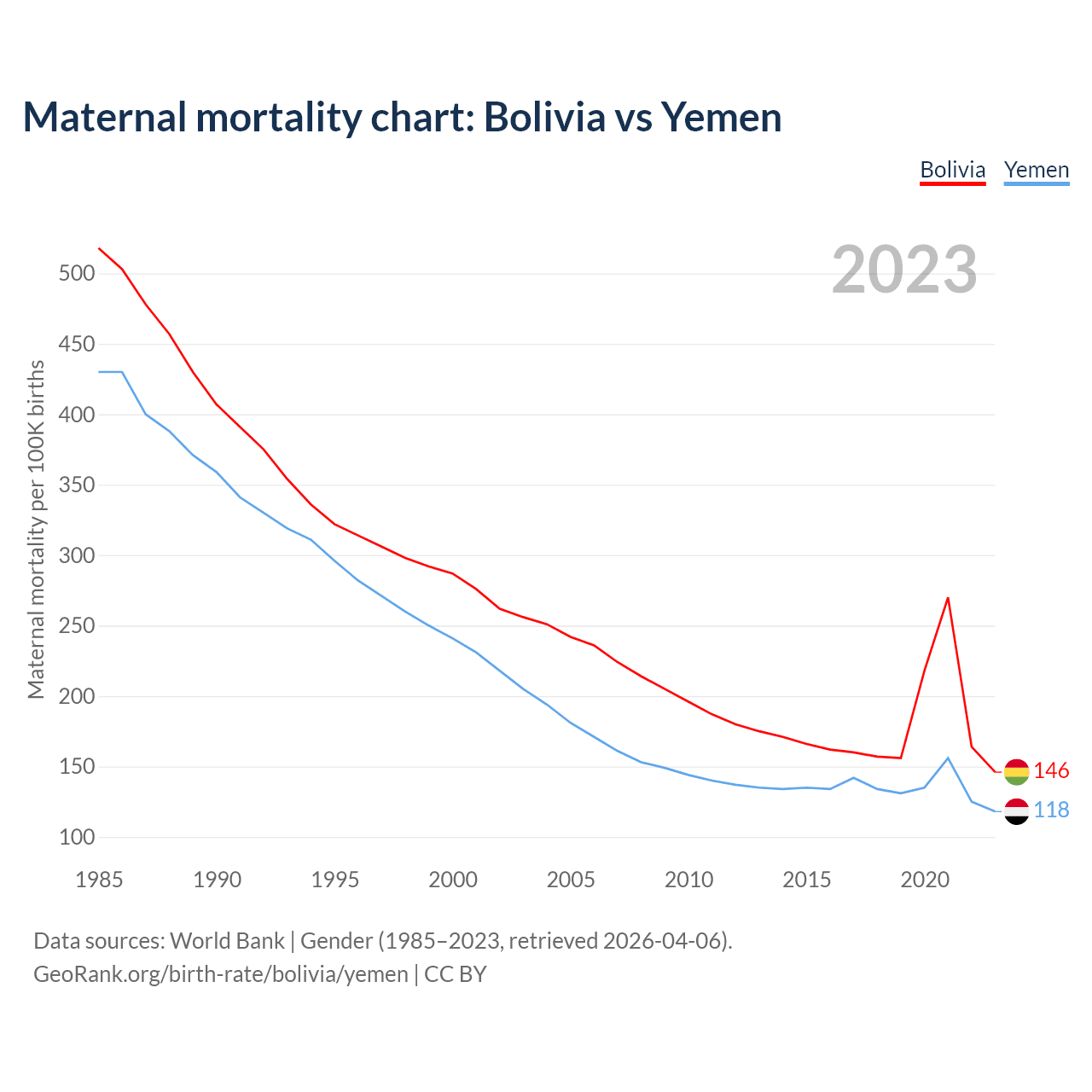 The maternal mortality rate, which is the probability of dying during childbirth or within 42 days of pregnancy termination, is 146 deaths per 100,000 live births in Bolivia, compared to 118 deaths in Yemen.