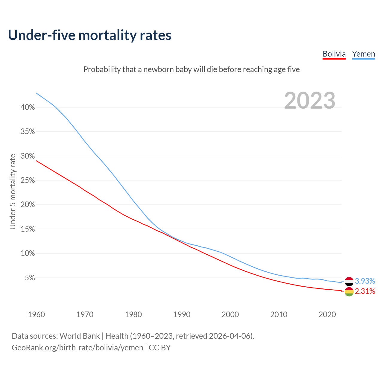 The chance that a newborn baby will die before reaching age five is 2.31% in Bolivia and 3.93% in Yemen. Above is a chart with historical data on under-five mortality rates.