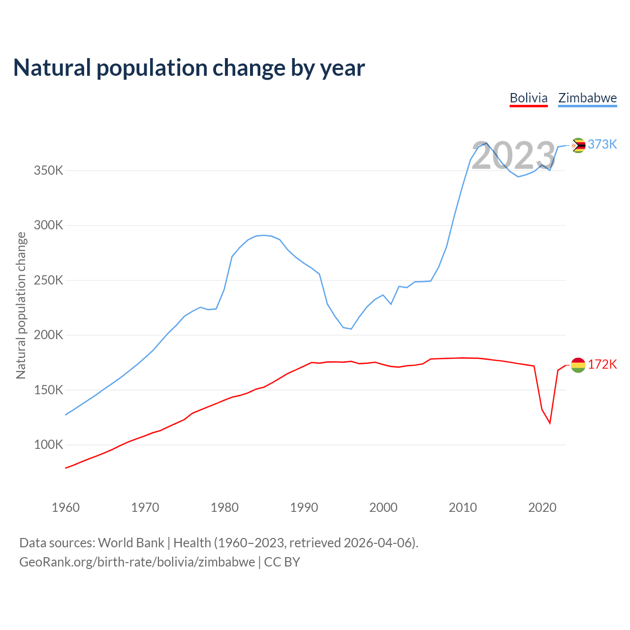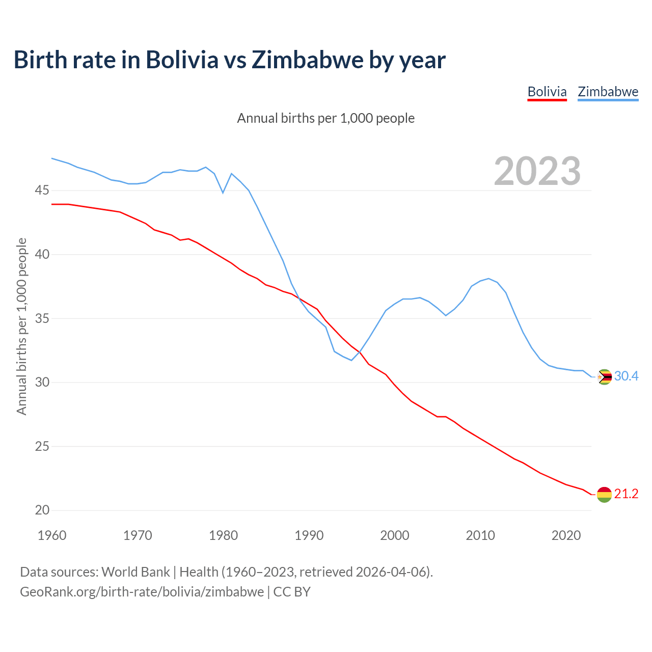 Bolivia has an annual birth rate of 21.2 births per 1,000 people, compared to 30.4 for Zimbabwe. The average number of children a woman is expected to have during her lifetime — the fertility rate, is 2.55 in Bolivia and 3.72 in Zimbabwe — 46.2% difference.