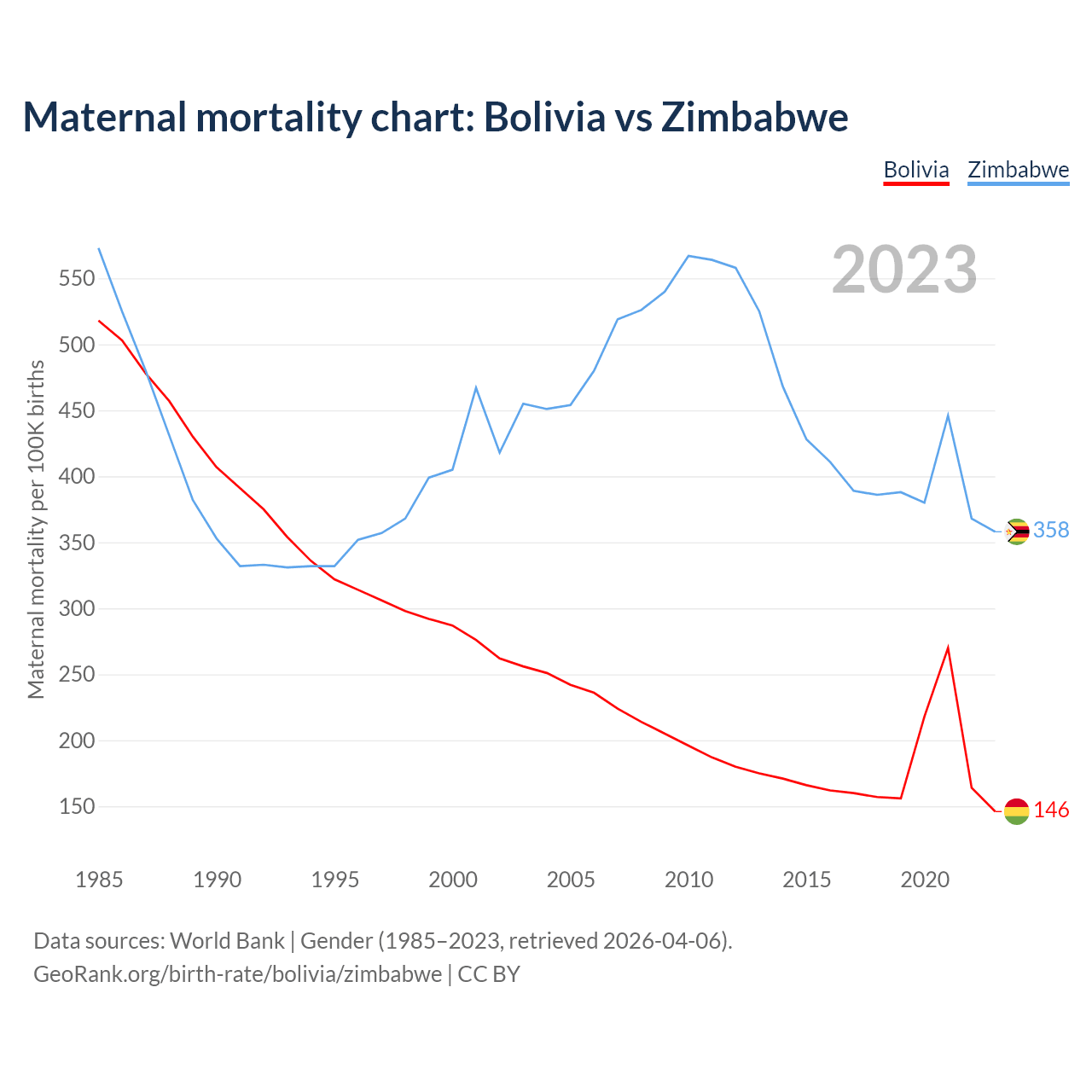 The maternal mortality rate, which is the probability of dying during childbirth or within 42 days of pregnancy termination, is 146 deaths per 100,000 live births in Bolivia, compared to 358 deaths in Zimbabwe.