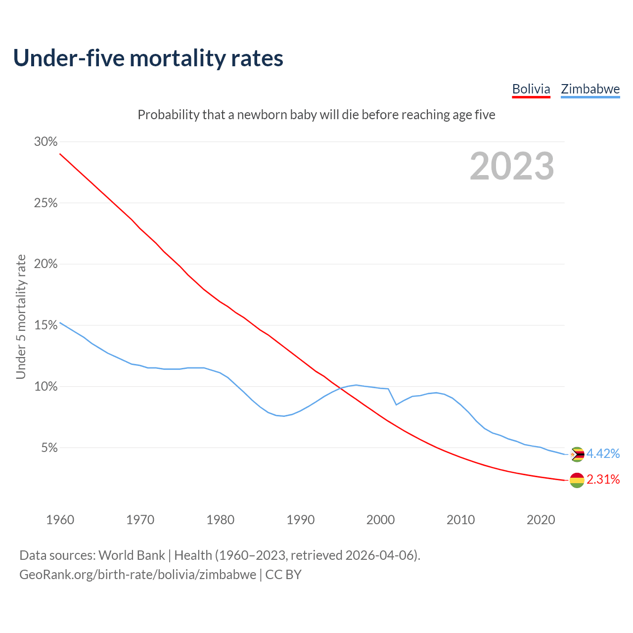 The chance that a newborn baby will die before reaching age five is 2.31% in Bolivia and 4.42% in Zimbabwe. Above is a chart with historical data on under-five mortality rates.