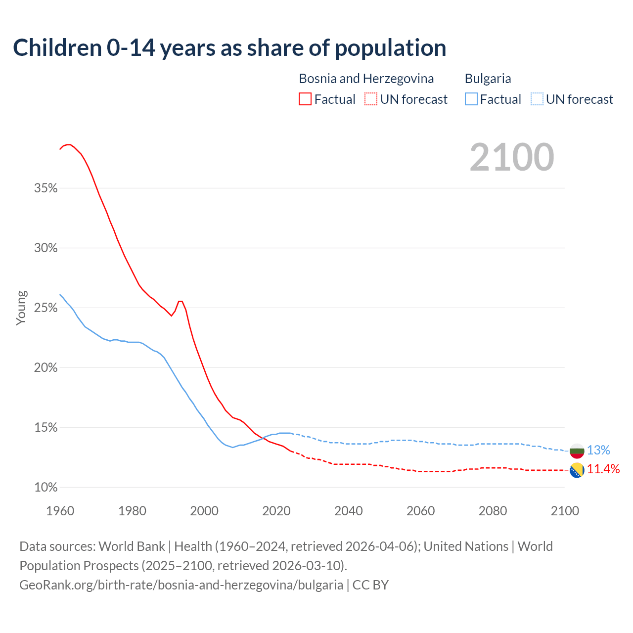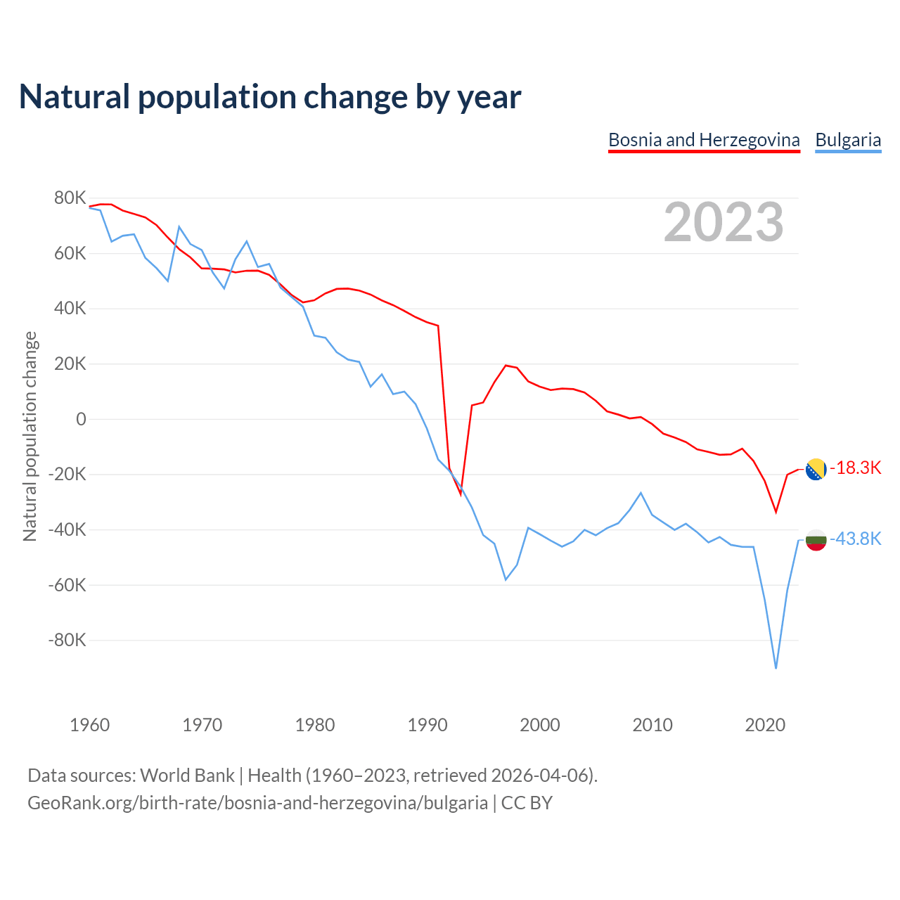 1960 vs 2023, the fertility rate has decreased by 62.5% in Bosnia and Herzegovina and by 21.6% in Bulgaria — in 1960, it was 3.96 and 2.31, respectively.