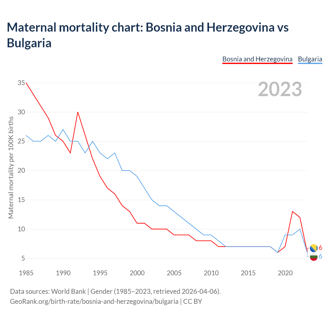 The maternal mortality rate, which is the probability of dying during childbirth or within 42 days of pregnancy termination, is 6 deaths per 100,000 live births in Bosnia and Herzegovina, compared to 6 deaths in Bulgaria.