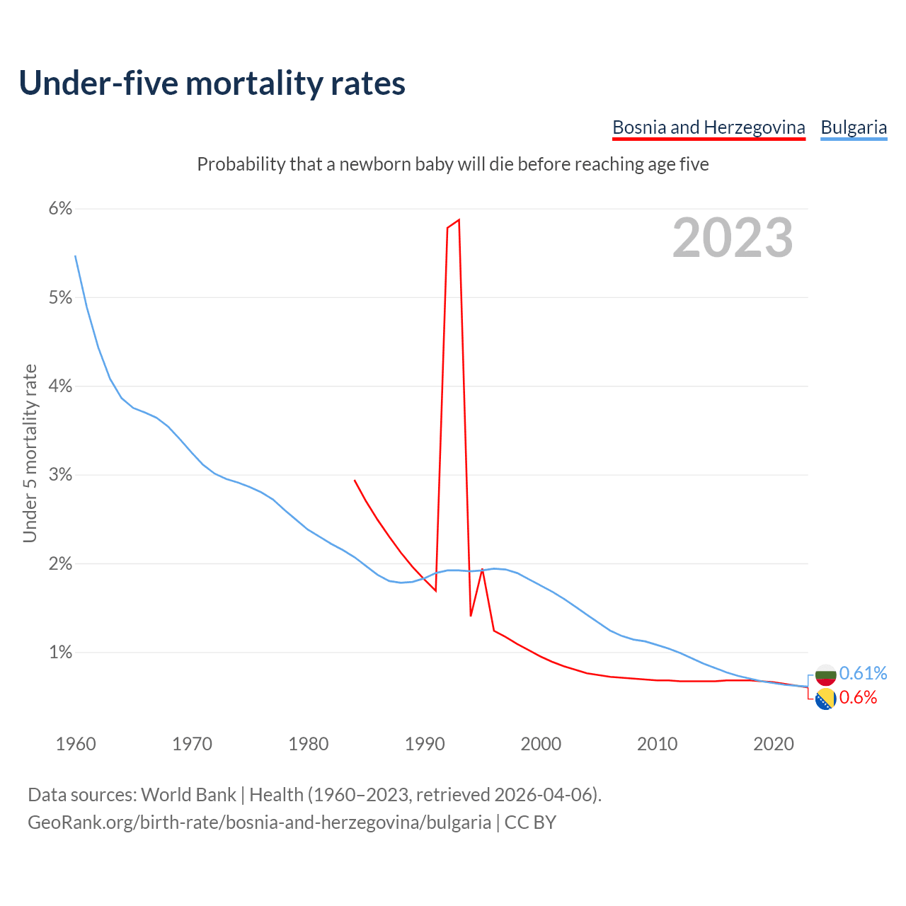 The chance that a newborn baby will die before reaching age five is 0.6% in Bosnia and Herzegovina and 0.61% in Bulgaria. Above is a chart with historical data on under-five mortality rates.