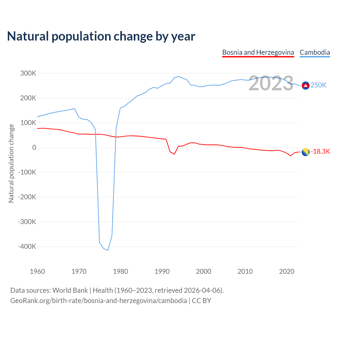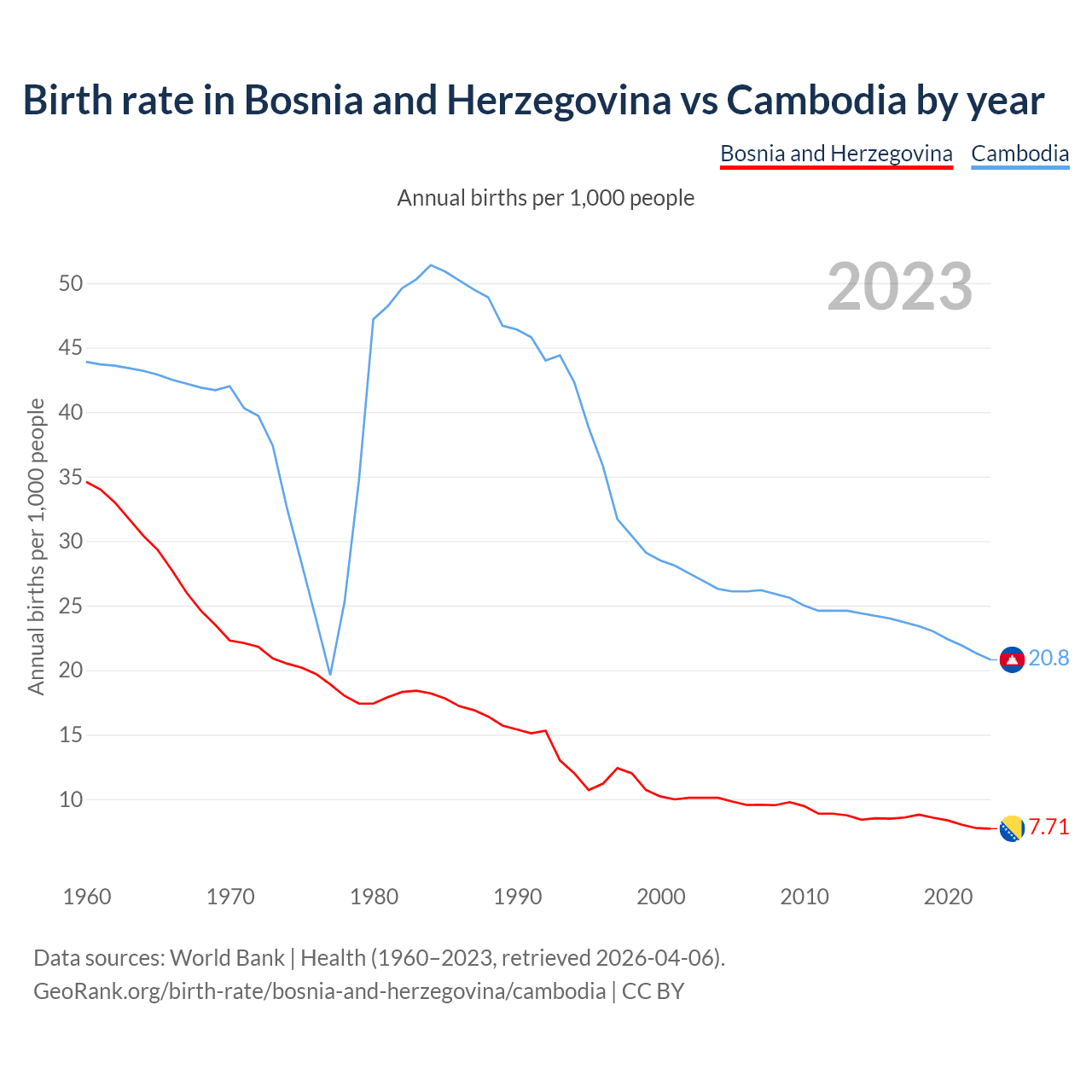 Bosnia and Herzegovina has an annual birth rate of 7.71 births per 1,000 people, compared to 20.8 for Cambodia. The average number of children a woman is expected to have during her lifetime — the fertility rate, is 1.49 in Bosnia and Herzegovina and 2.58 in Cambodia — 73.6% difference.