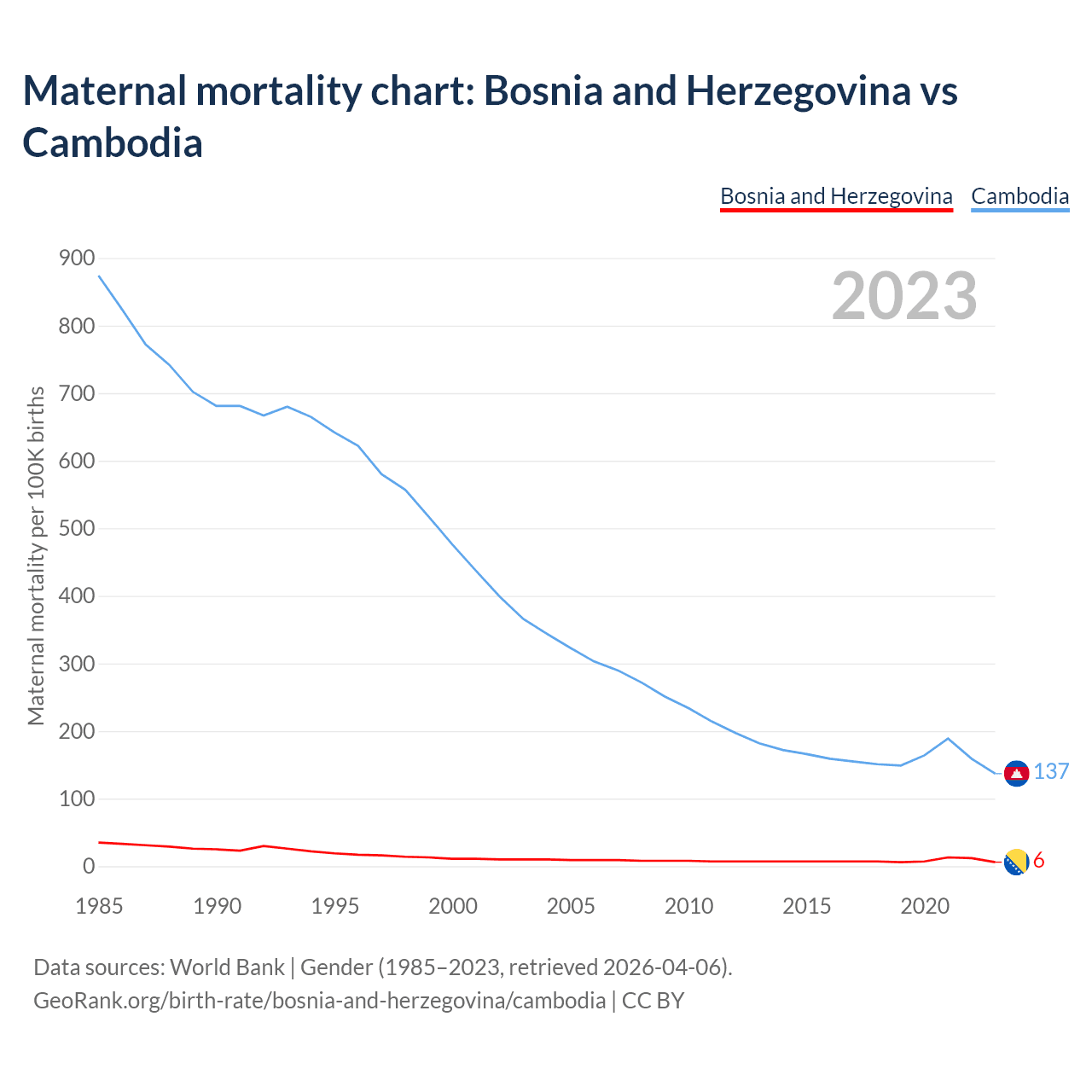 The maternal mortality rate, which is the probability of dying during childbirth or within 42 days of pregnancy termination, is 6 deaths per 100,000 live births in Bosnia and Herzegovina, compared to 137 deaths in Cambodia.