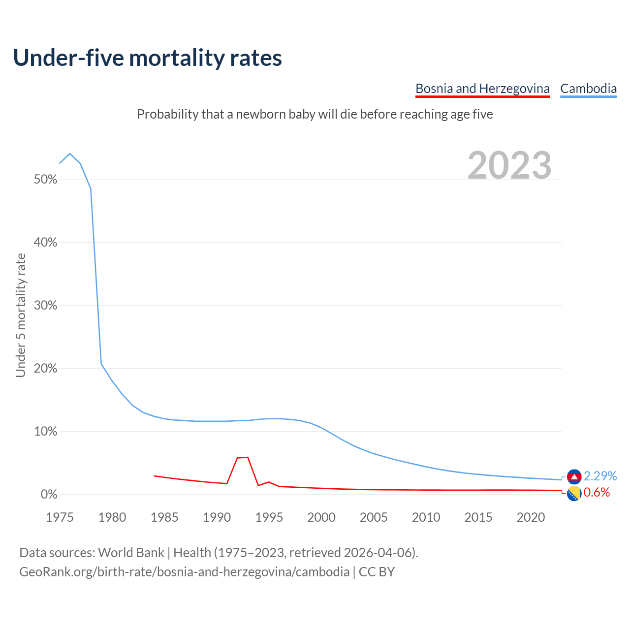 The chance that a newborn baby will die before reaching age five is 0.6% in Bosnia and Herzegovina and 2.29% in Cambodia. Above is a chart with historical data on under-five mortality rates.