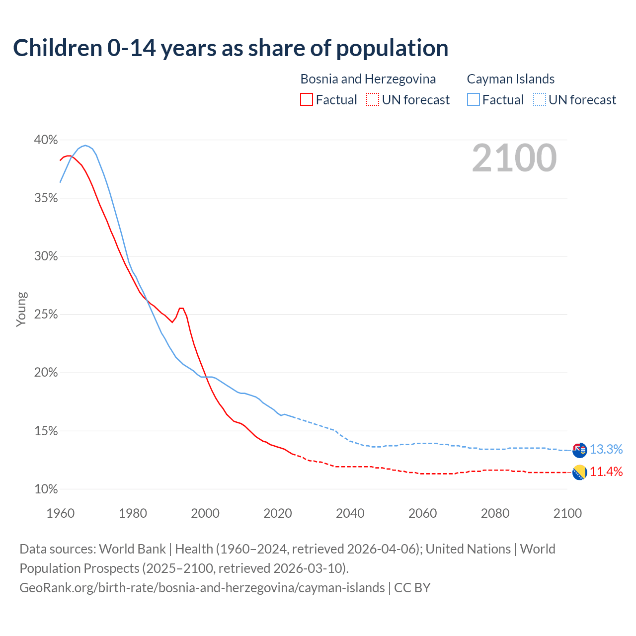 Children aged 0-14 make up 13% of the population in Bosnia and Herzegovina and 16.2% in the Cayman Islands in 2024, compared to 24.6% and 22.3% respectively in 1990.