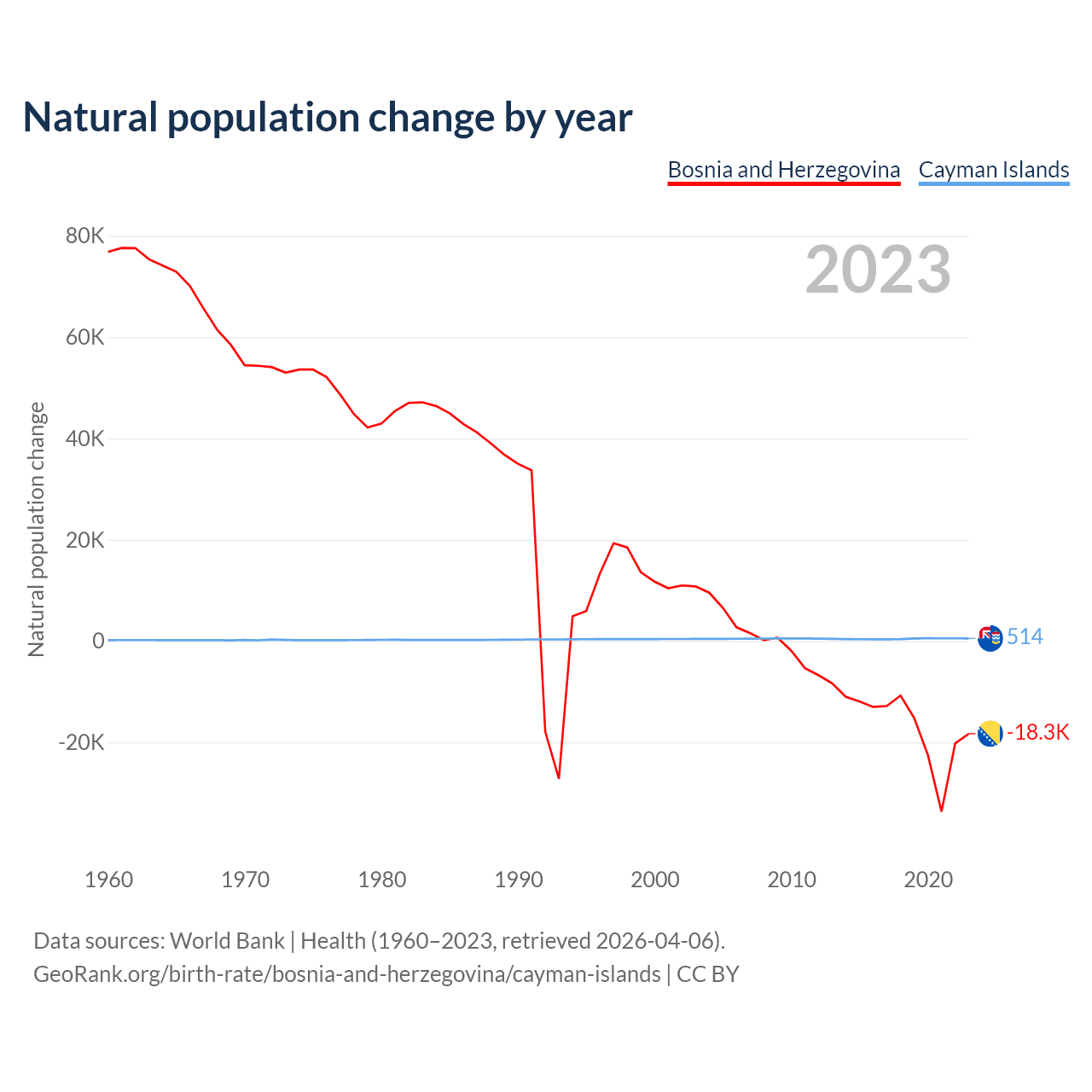 Bosnia and Herzegovina has an annual birth rate of 7.71 births per 1,000 people, compared to 11.8 for the Cayman Islands. The average number of children a woman is expected to have during her lifetime — the fertility rate, is 1.49 in Bosnia and Herzegovina and 1.53 in the Cayman Islands — 3.03% difference.