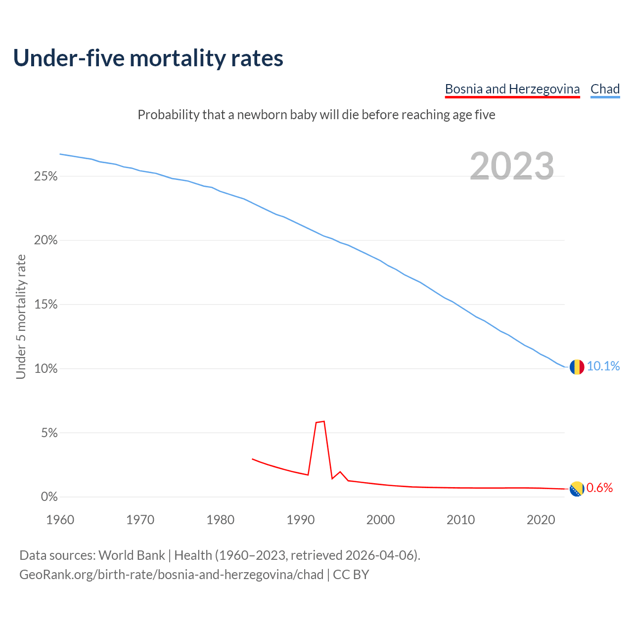 The chance that a newborn baby will die before reaching age five is 0.6% in Bosnia and Herzegovina and 10.1% in Chad. Above is a chart with historical data on under-five mortality rates.