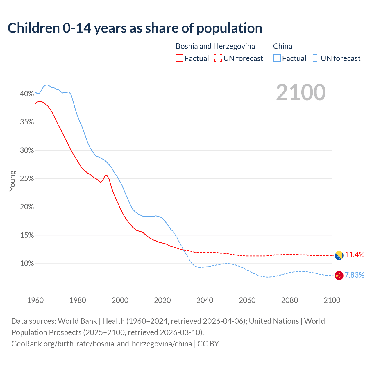 1960 vs 2023, the fertility rate has decreased by 62.5% in Bosnia and Herzegovina and by 77.6% in China — in 1960, it was 3.96 and 4.45, respectively.
