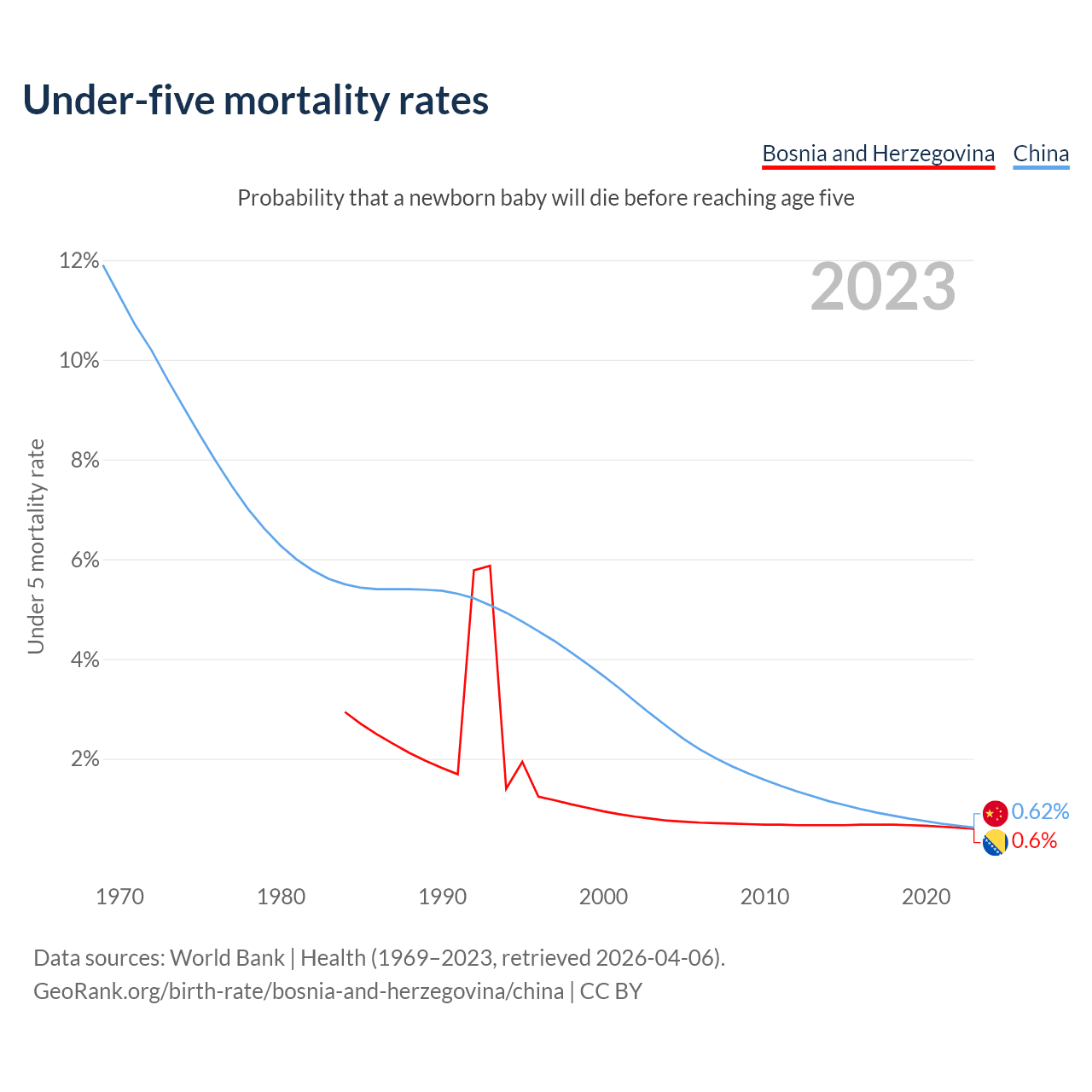 The chance that a newborn baby will die before reaching age five is 0.6% in Bosnia and Herzegovina and 0.62% in China. Above is a chart with historical data on under-five mortality rates.