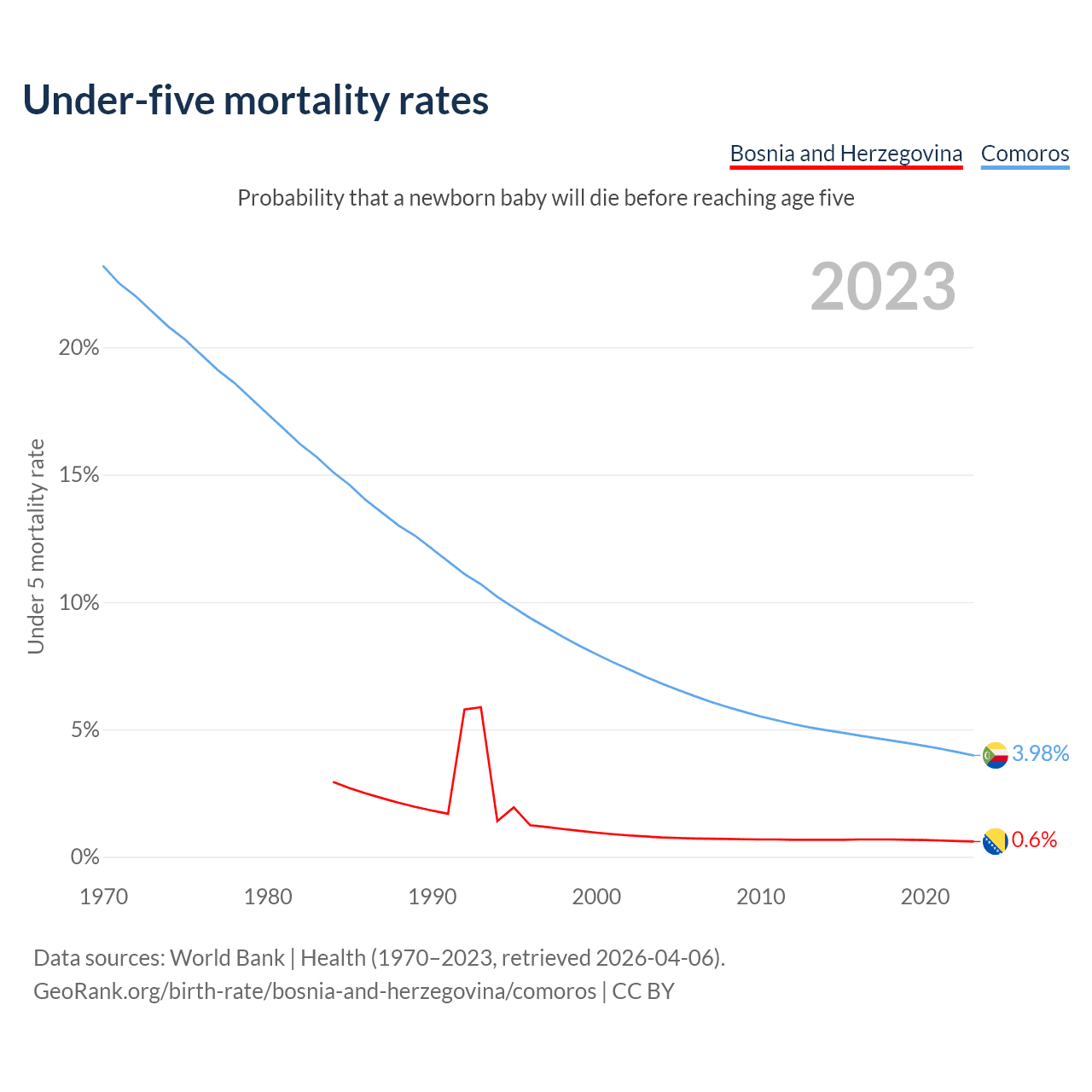 The chance that a newborn baby will die before reaching age five is 0.6% in Bosnia and Herzegovina and 3.98% in Comoros. Above is a chart with historical data on under-five mortality rates.
