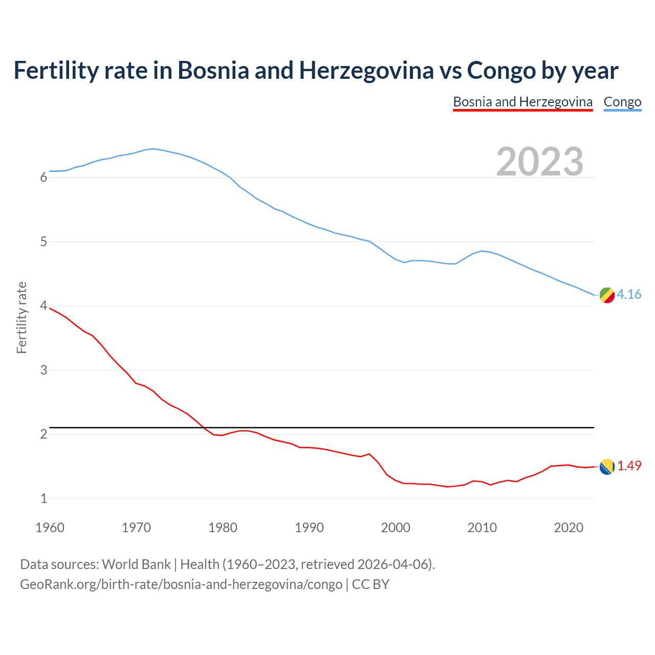 1960 vs 2023, the fertility rate has decreased by 62.5% in Bosnia and Herzegovina and by 31.7% in the Congo — in 1960, it was 3.96 and 6.09, respectively.