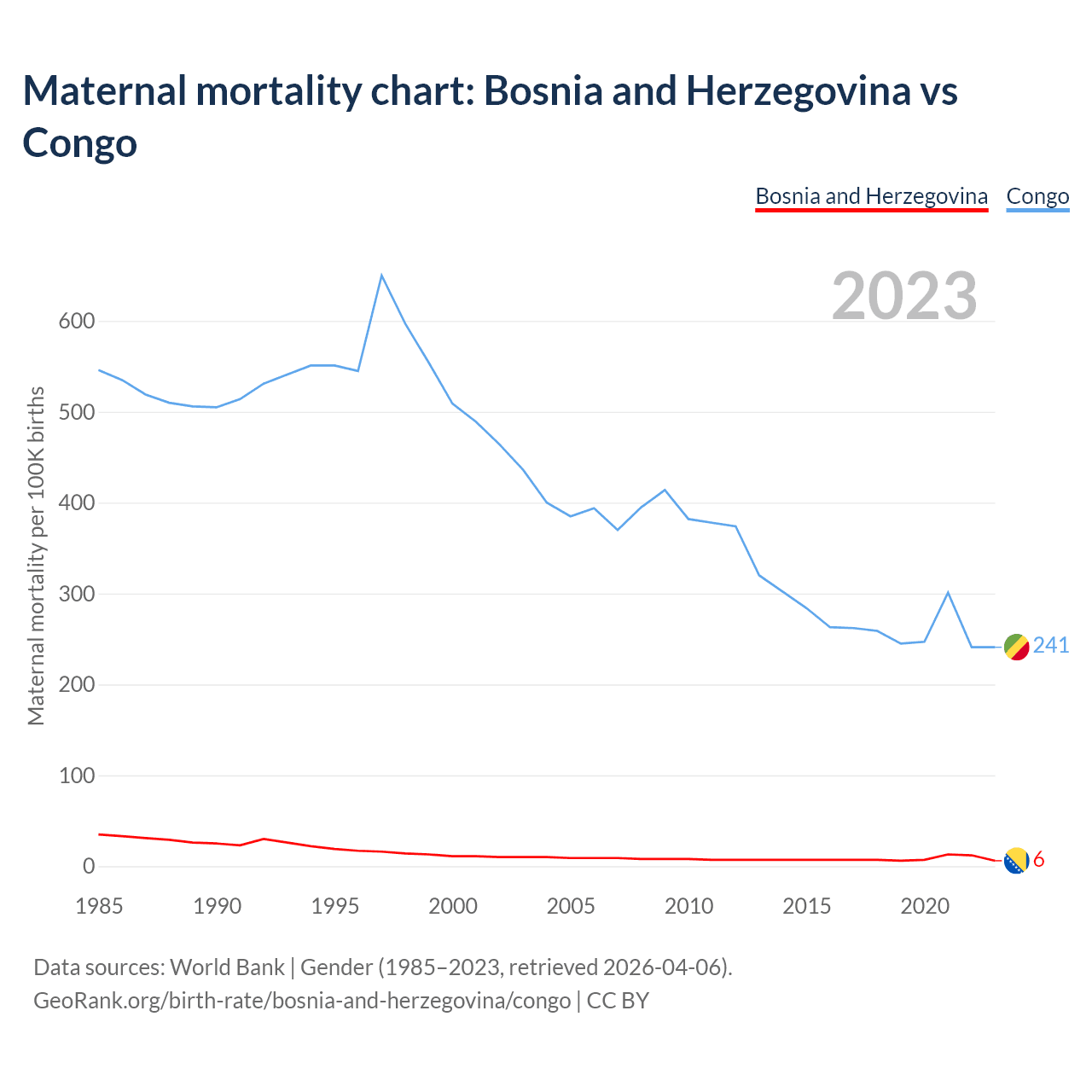 The maternal mortality rate, which is the probability of dying during childbirth or within 42 days of pregnancy termination, is 6 deaths per 100,000 live births in Bosnia and Herzegovina, compared to 241 deaths in the Congo.