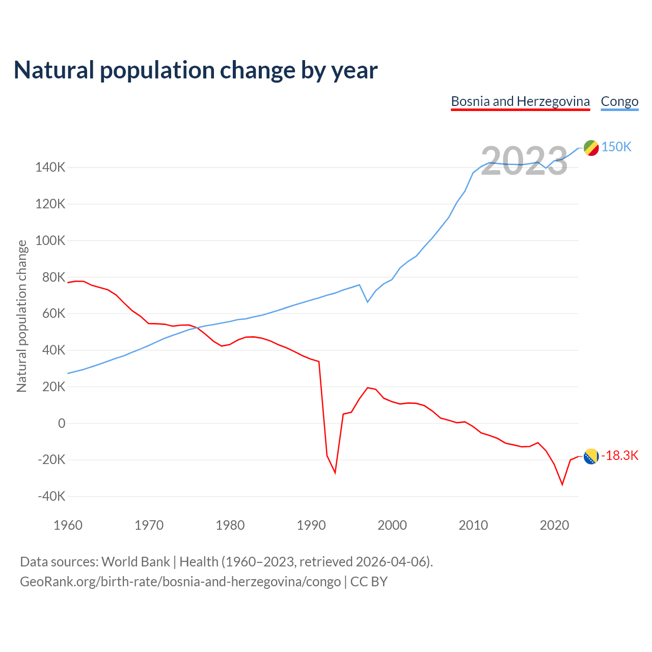 Bosnia and Herzegovina has an annual birth rate of 7.71 births per 1,000 people, compared to 30.6 for the Congo. The average number of children a woman is expected to have during her lifetime — the fertility rate, is 1.49 in Bosnia and Herzegovina and 4.16 in the Congo — 179.7% difference.
