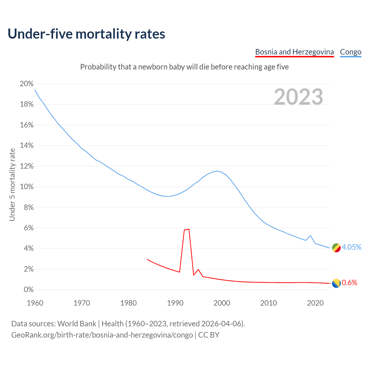 The chance that a newborn baby will die before reaching age five is 0.6% in Bosnia and Herzegovina and 4.05% in the Congo. Above is a chart with historical data on under-five mortality rates.