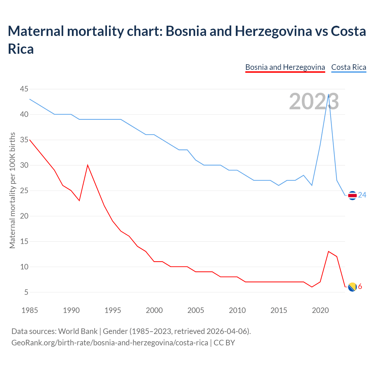 The maternal mortality rate, which is the probability of dying during childbirth or within 42 days of pregnancy termination, is 6 deaths per 100,000 live births in Bosnia and Herzegovina, compared to 24 deaths in Costa Rica.