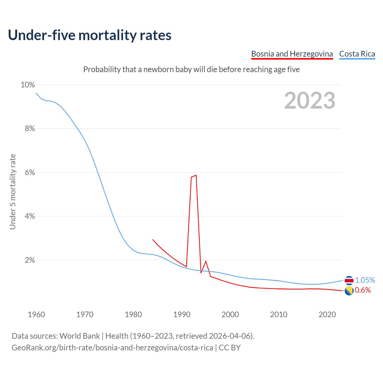 The chance that a newborn baby will die before reaching age five is 0.6% in Bosnia and Herzegovina and 1.05% in Costa Rica. Above is a chart with historical data on under-five mortality rates.
