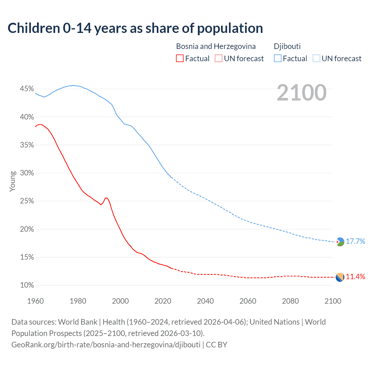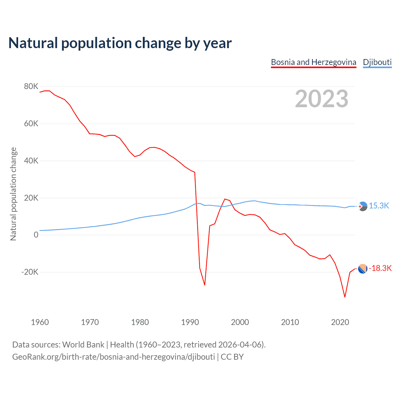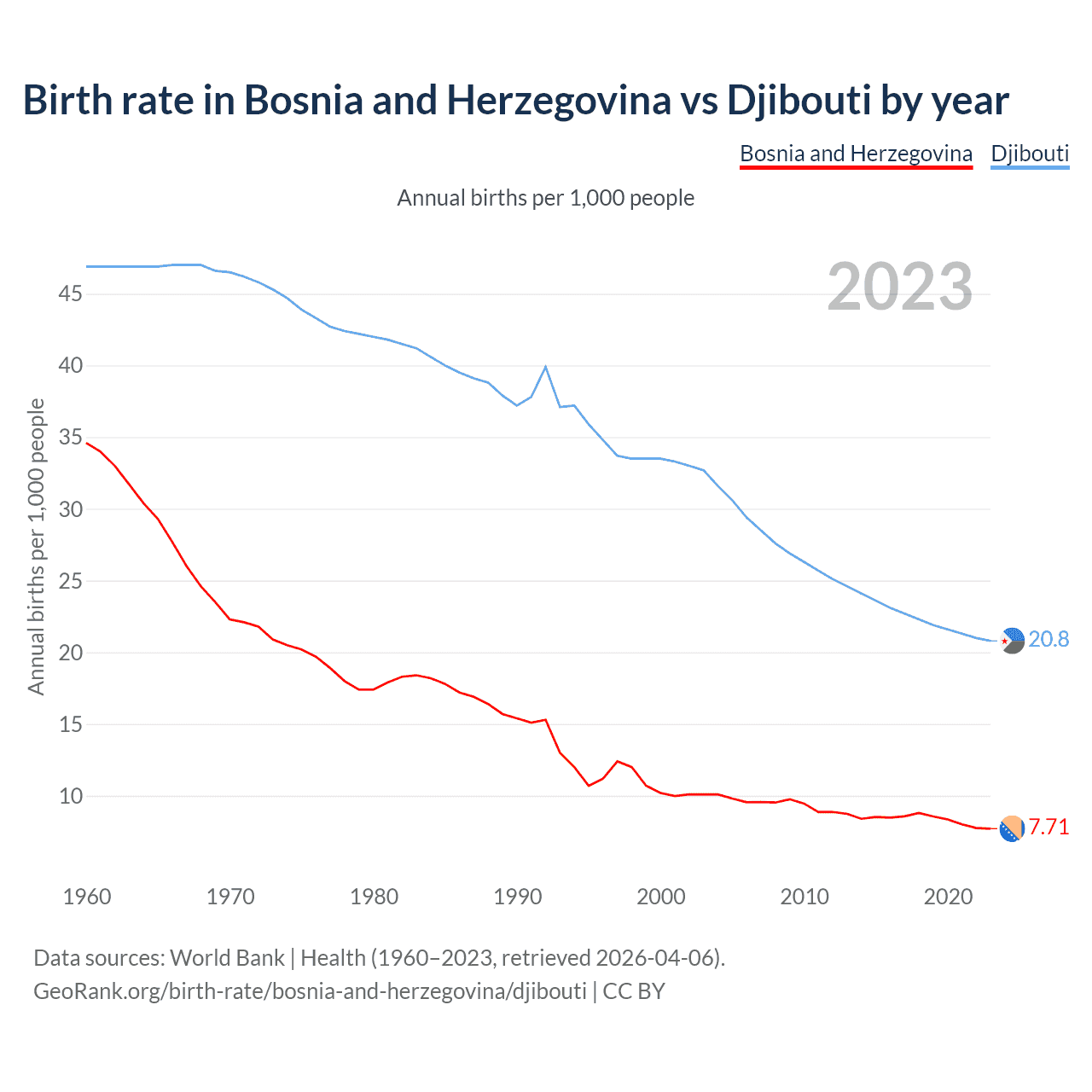 Bosnia and Herzegovina has an annual birth rate of 7.71 births per 1,000 people, compared to 20.8 for Djibouti. The average number of children a woman is expected to have during her lifetime — the fertility rate, is 1.49 in Bosnia and Herzegovina and 2.61 in Djibouti — 75.6% difference.