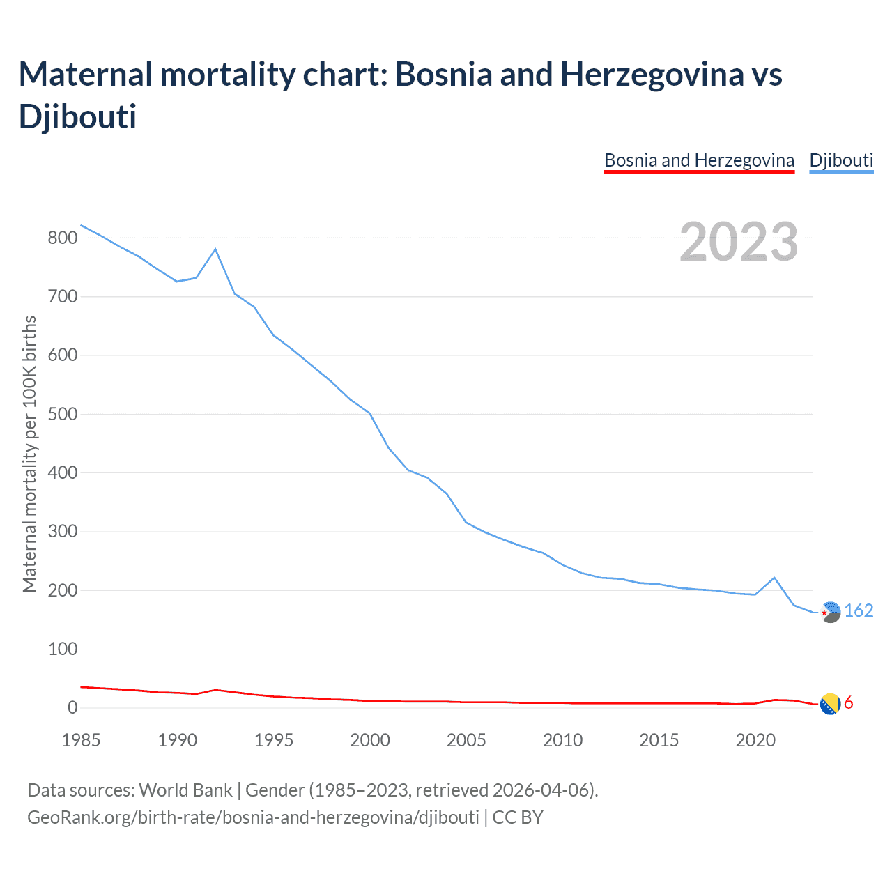 The maternal mortality rate, which is the probability of dying during childbirth or within 42 days of pregnancy termination, is 6 deaths per 100,000 live births in Bosnia and Herzegovina, compared to 162 deaths in Djibouti.