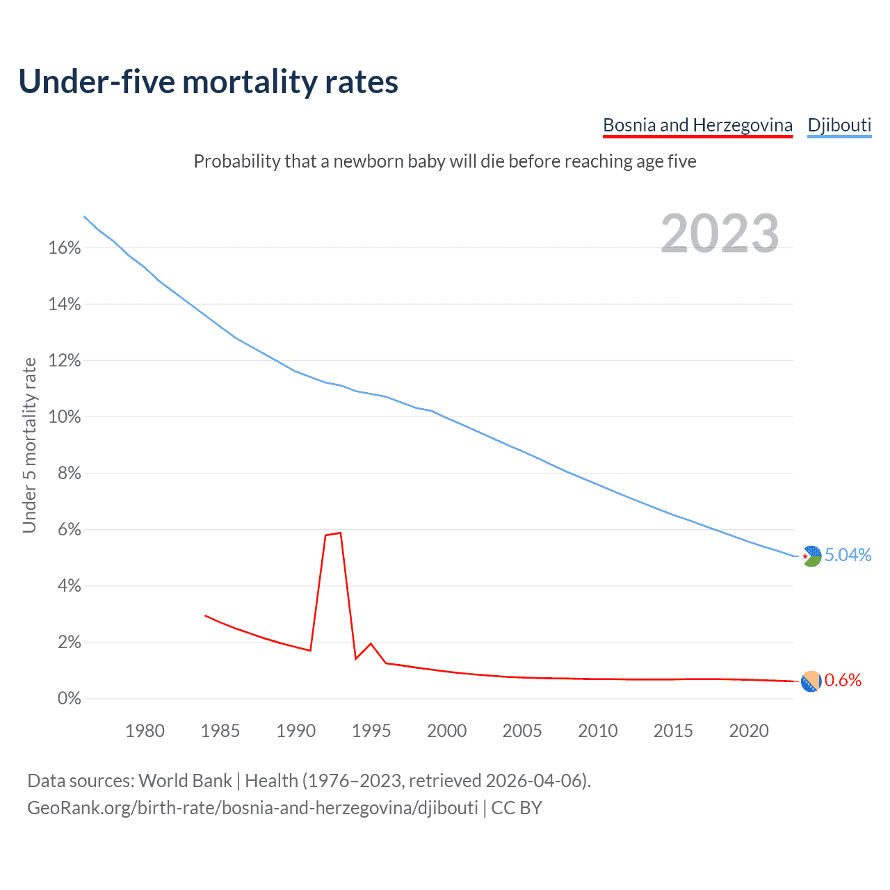 The chance that a newborn baby will die before reaching age five is 0.6% in Bosnia and Herzegovina and 5.04% in Djibouti. Above is a chart with historical data on under-five mortality rates.
