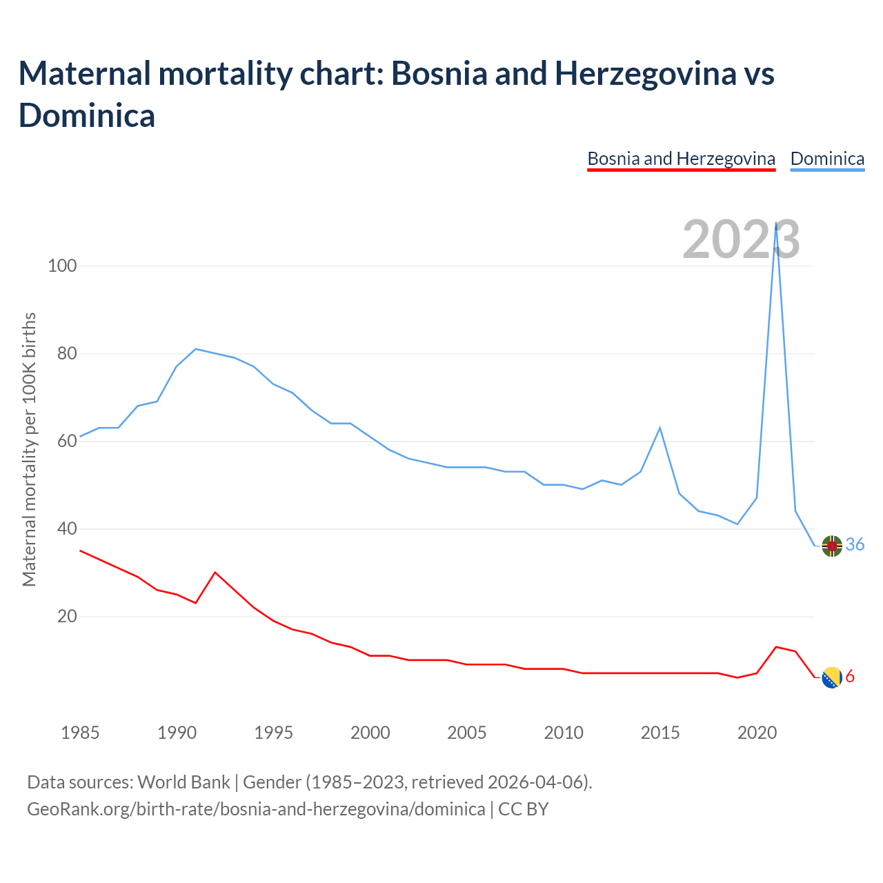 The maternal mortality rate, which is the probability of dying during childbirth or within 42 days of pregnancy termination, is 6 deaths per 100,000 live births in Bosnia and Herzegovina, compared to 36 deaths in Dominica.