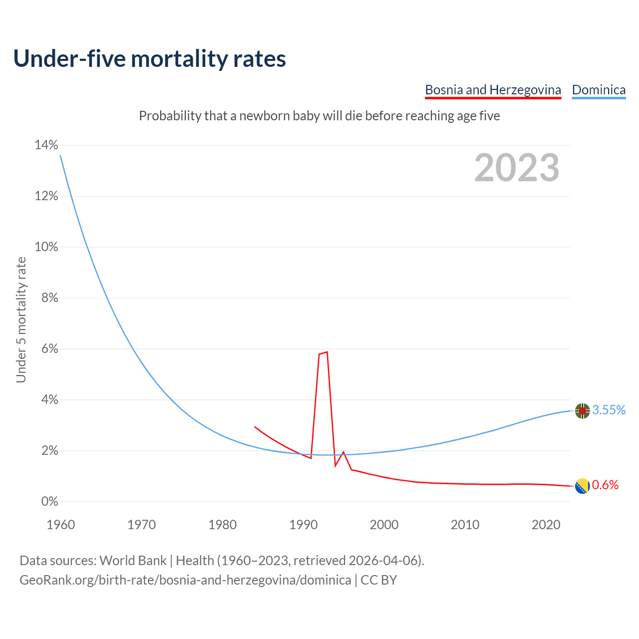 The chance that a newborn baby will die before reaching age five is 0.6% in Bosnia and Herzegovina and 3.55% in Dominica. Above is a chart with historical data on under-five mortality rates.