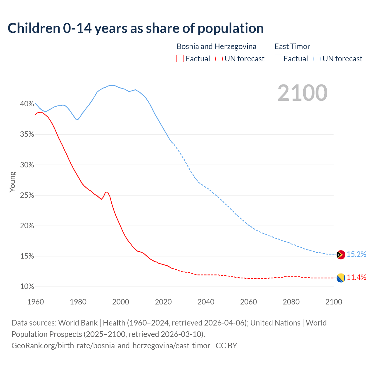 Children aged 0-14 make up 13% of the population in Bosnia and Herzegovina and 33.7% in East Timor in 2024, compared to 24.6% and 42.2% respectively in 1990.