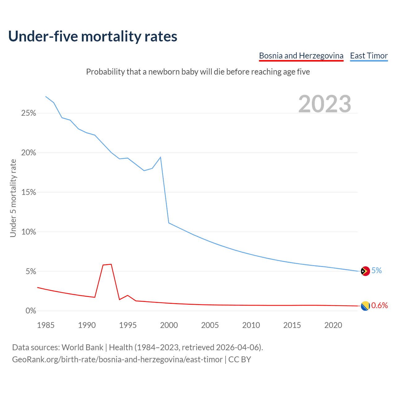 The chance that a newborn baby will die before reaching age five is 0.6% in Bosnia and Herzegovina and 5% in East Timor. Above is a chart with historical data on under-five mortality rates.