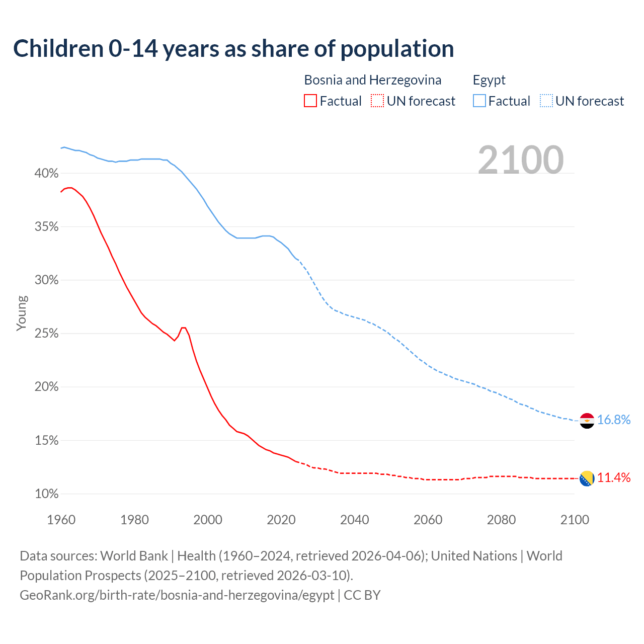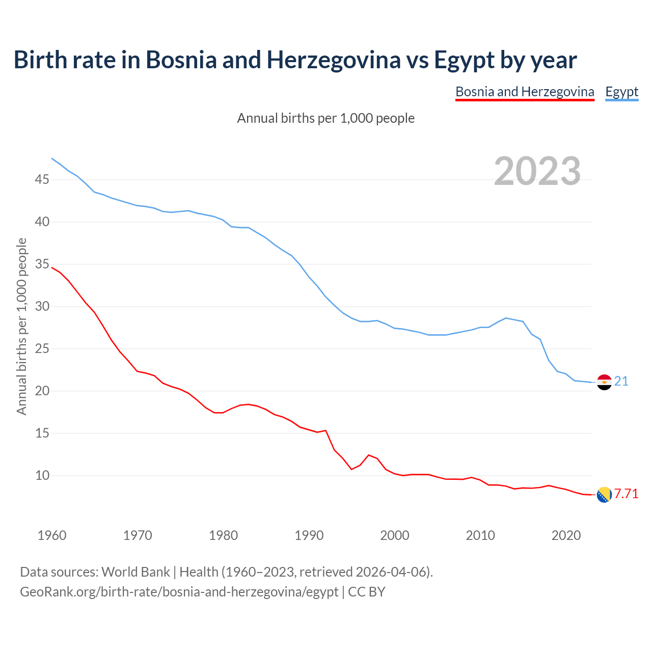 Bosnia and Herzegovina has an annual birth rate of 7.71 births per 1,000 people, compared to 21 for Egypt. The average number of children a woman is expected to have during her lifetime — the fertility rate, is 1.49 in Bosnia and Herzegovina and 2.75 in Egypt — 85.1% difference.