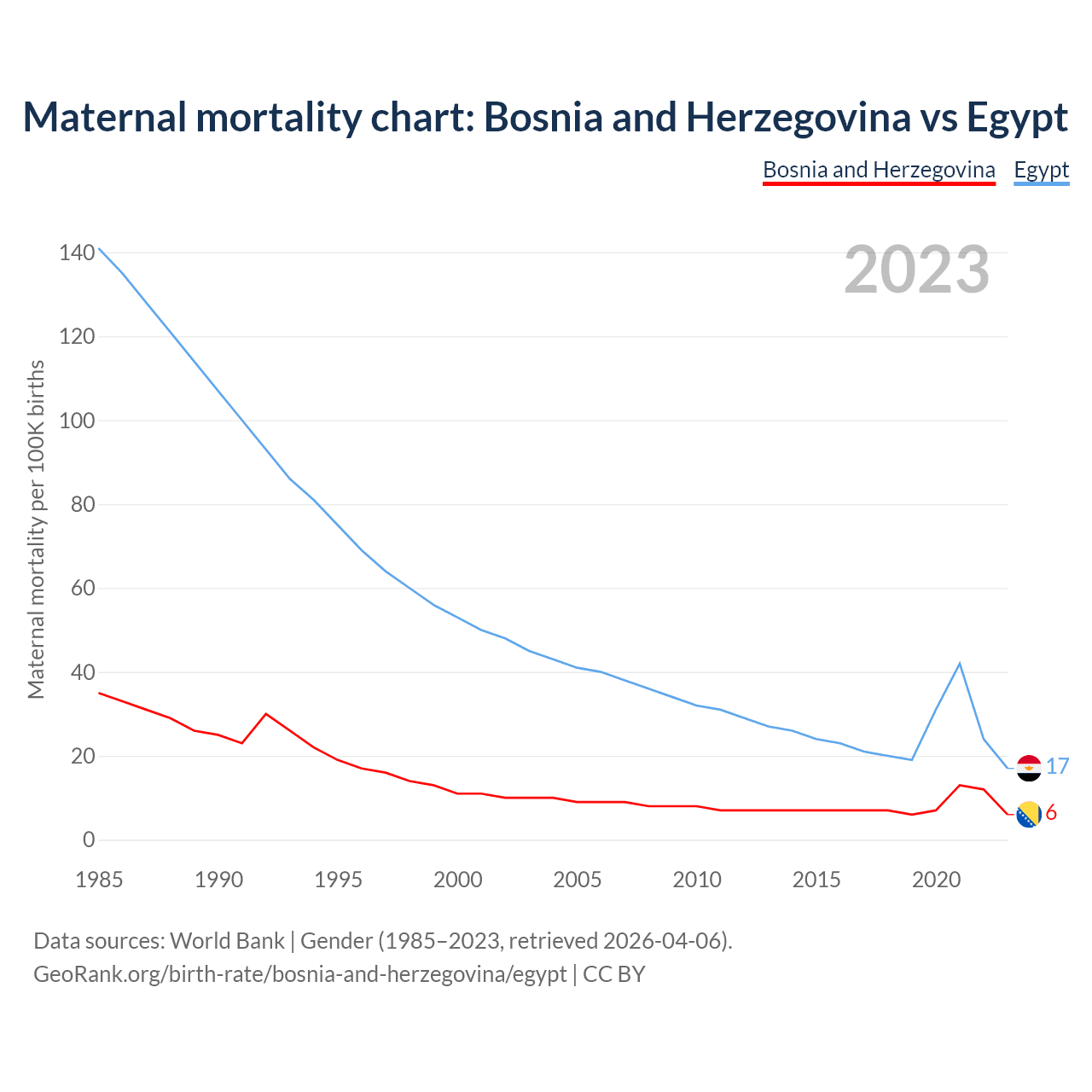 The maternal mortality rate, which is the probability of dying during childbirth or within 42 days of pregnancy termination, is 6 deaths per 100,000 live births in Bosnia and Herzegovina, compared to 17 deaths in Egypt.
