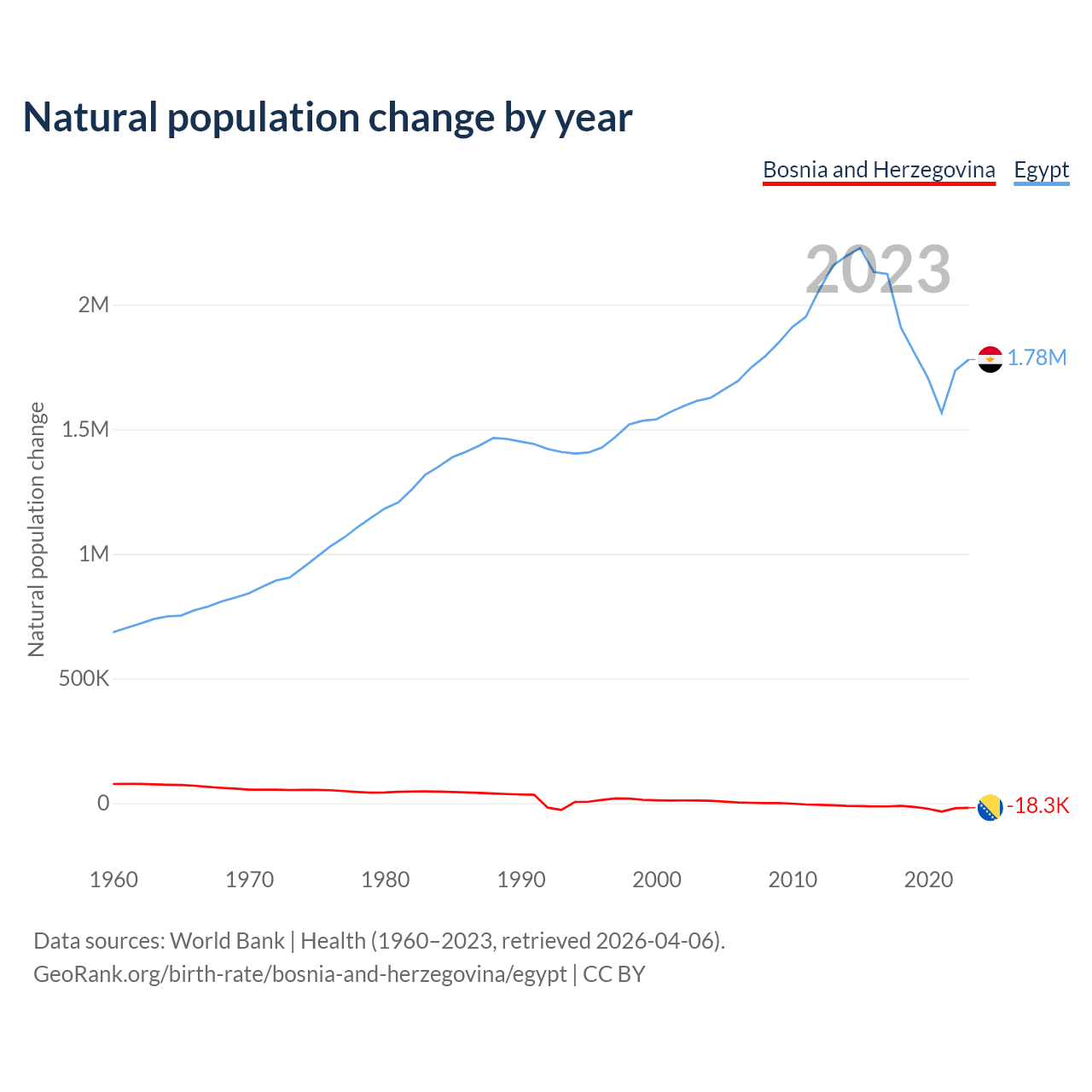 According to the latest available data on birth rates, the fertility rate in Bosnia and Herzegovina was 1.49 children per woman in 2023, compared to 2.75 in Egypt in 2023. The replacement level is considered to be 2.1 children per woman.