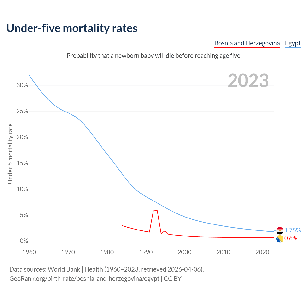 The chance that a newborn baby will die before reaching age five is 0.6% in Bosnia and Herzegovina and 1.75% in Egypt. Above is a chart with historical data on under-five mortality rates.