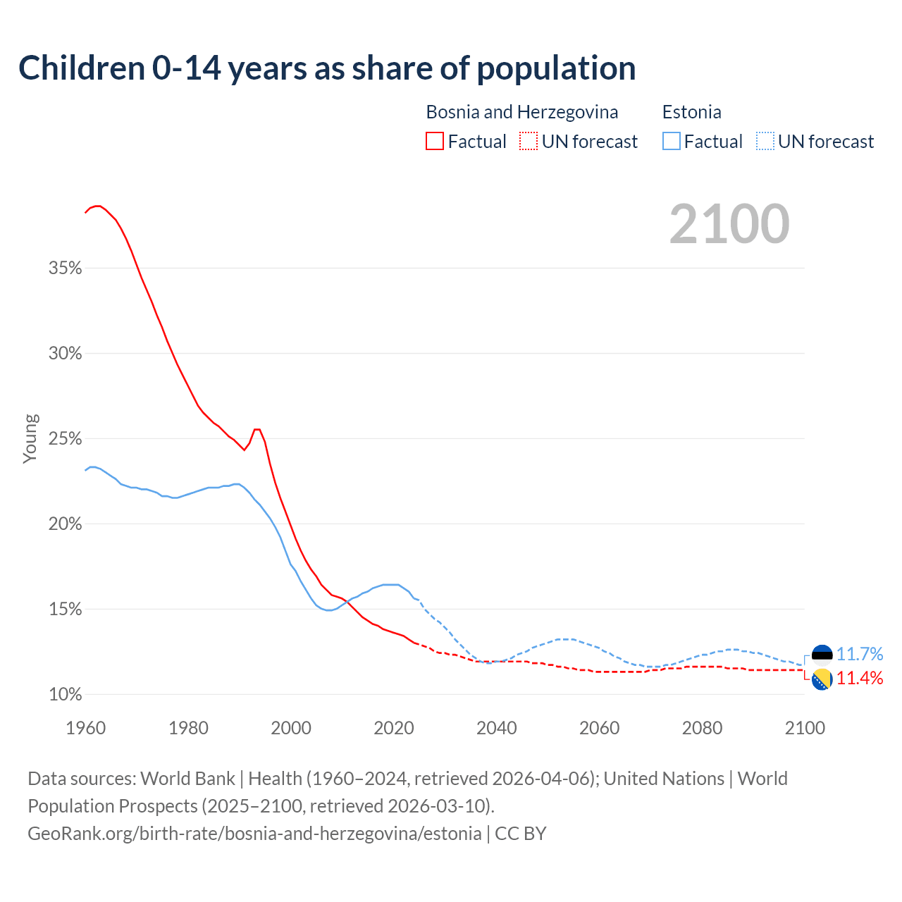 Bosnia and Herzegovina has an annual birth rate of 7.71 births per 1,000 people, compared to 8 for Estonia. The average number of children a woman is expected to have during her lifetime — the fertility rate, is 1.49 in Bosnia and Herzegovina and 1.31 in Estonia — 11.8% difference.