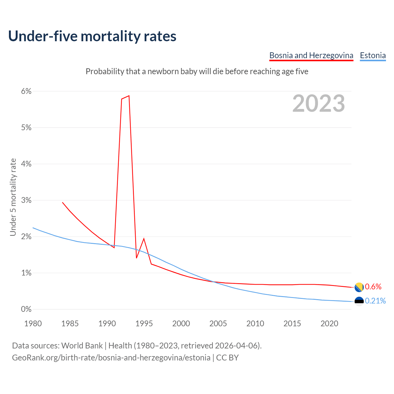 The chance that a newborn baby will die before reaching age five is 0.6% in Bosnia and Herzegovina and 0.21% in Estonia. Above is a chart with historical data on under-five mortality rates.