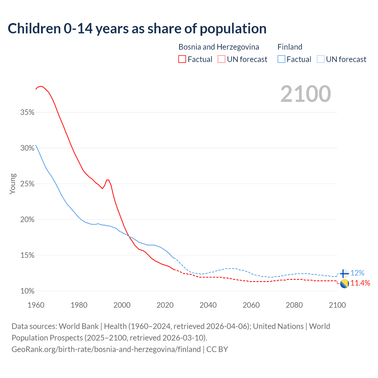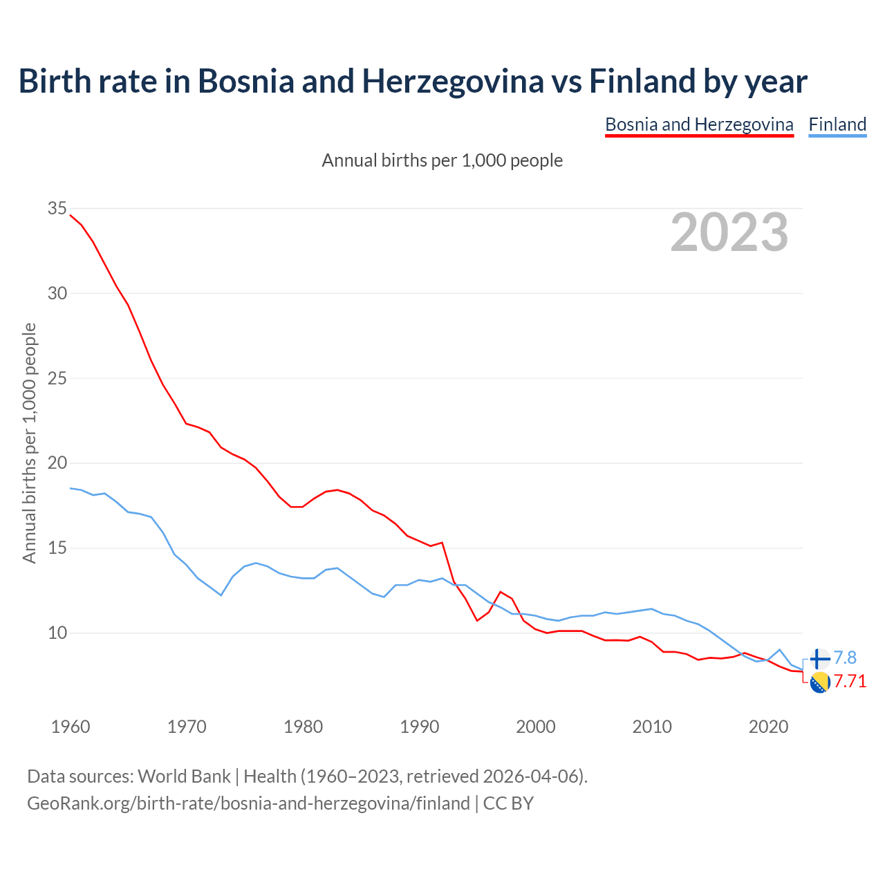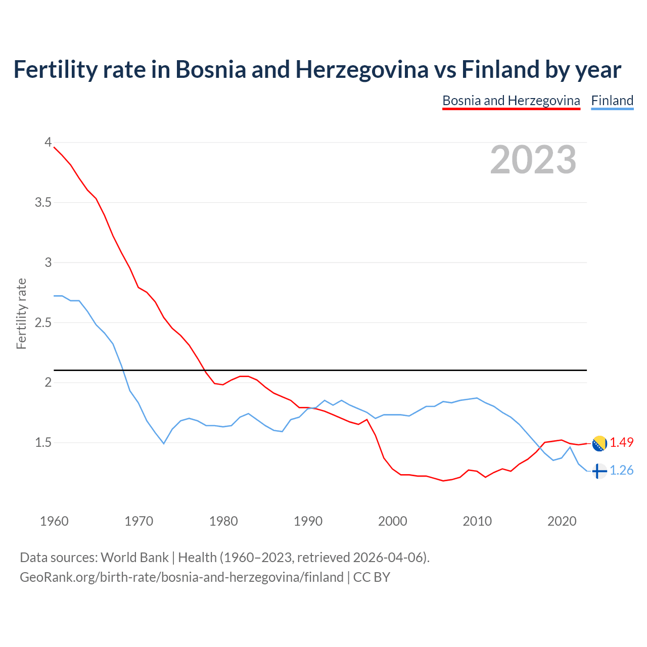 Bosnia and Herzegovina has an annual birth rate of 7.71 births per 1,000 people, compared to 7.8 for Finland. The average number of children a woman is expected to have during her lifetime — the fertility rate, is 1.49 in Bosnia and Herzegovina and 1.26 in Finland — 15.2% difference.