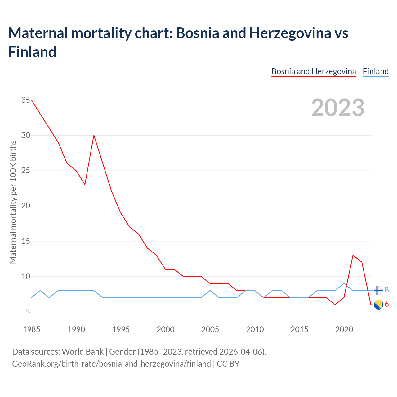 The maternal mortality rate, which is the probability of dying during childbirth or within 42 days of pregnancy termination, is 6 deaths per 100,000 live births in Bosnia and Herzegovina, compared to 8 deaths in Finland.