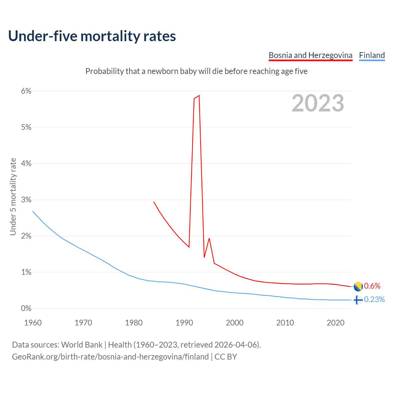 The chance that a newborn baby will die before reaching age five is 0.6% in Bosnia and Herzegovina and 0.23% in Finland. Above is a chart with historical data on under-five mortality rates.