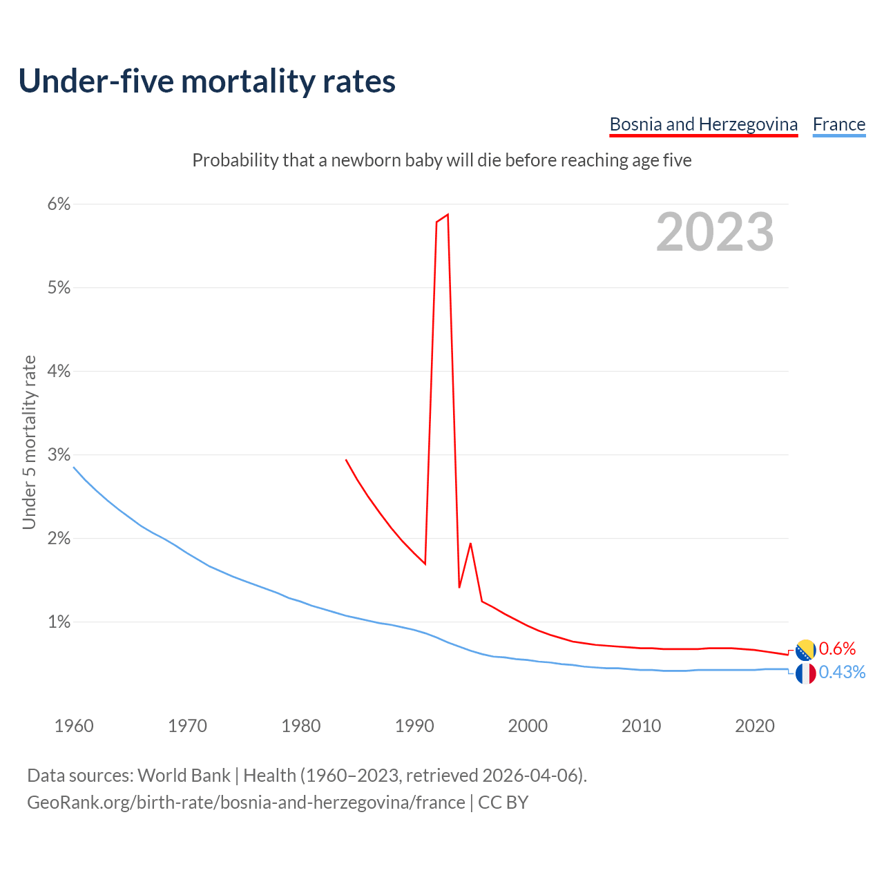 The chance that a newborn baby will die before reaching age five is 0.6% in Bosnia and Herzegovina and 0.43% in France. Above is a chart with historical data on under-five mortality rates.