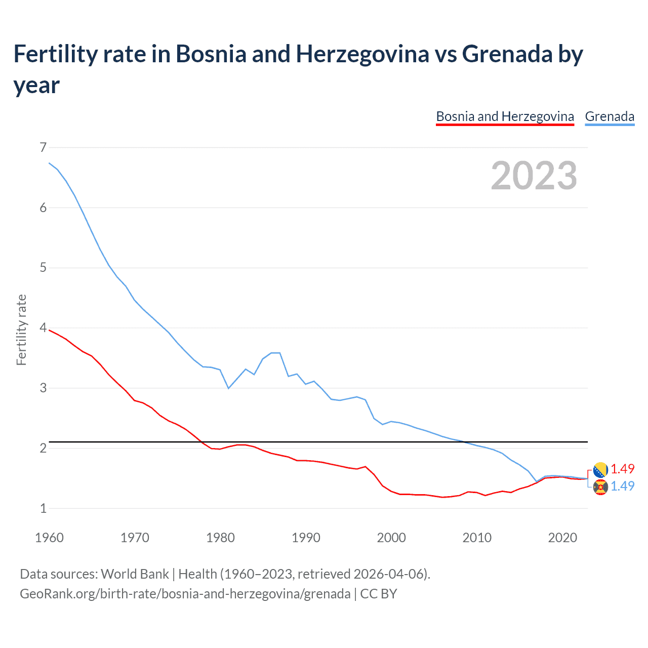 According to the latest available data on birth rates, the fertility rate in Bosnia and Herzegovina was 1.49 children per woman in 2023, compared to 1.49 in Grenada in 2023. The replacement level is considered to be 2.1 children per woman.