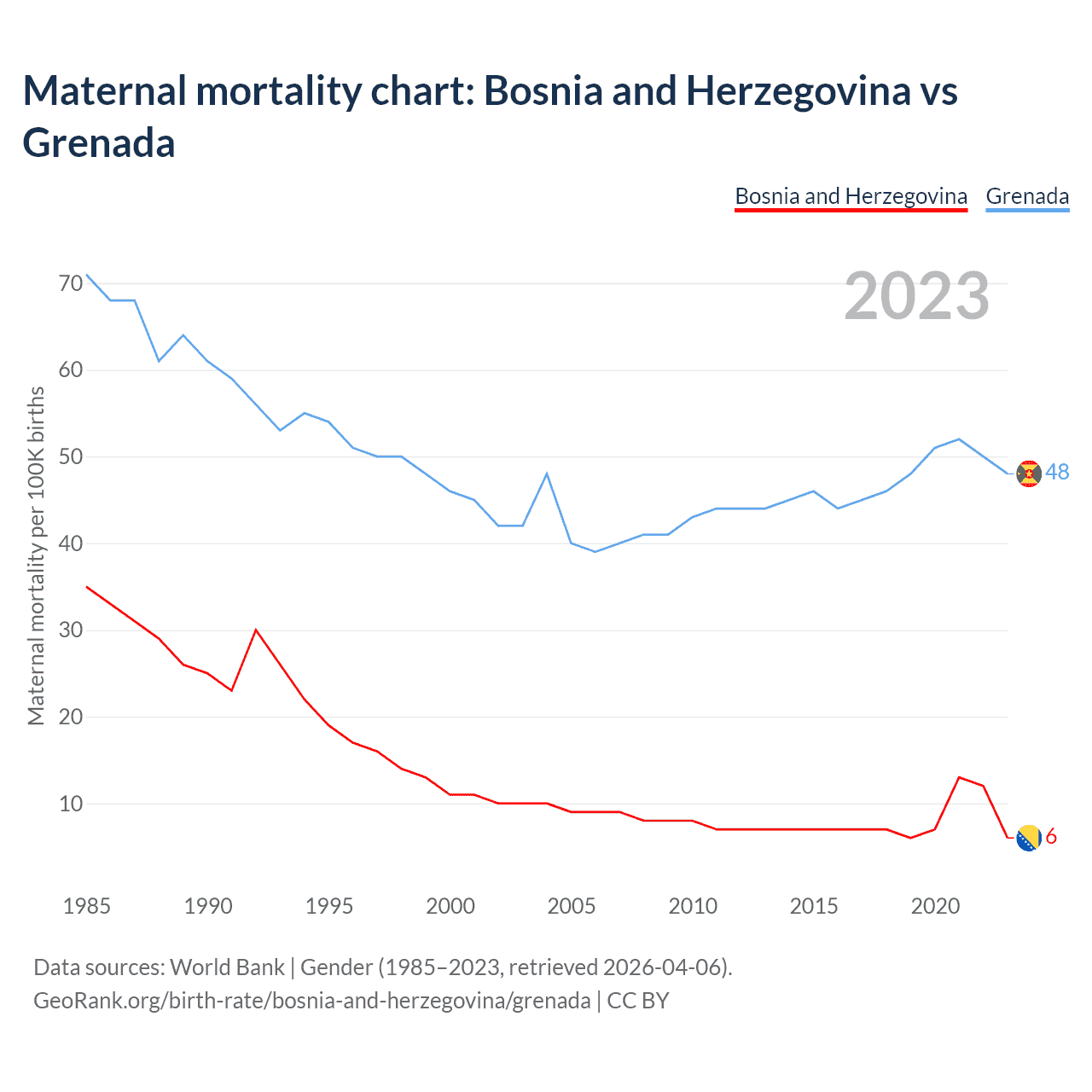 The maternal mortality rate, which is the probability of dying during childbirth or within 42 days of pregnancy termination, is 6 deaths per 100,000 live births in Bosnia and Herzegovina, compared to 48 deaths in Grenada.
