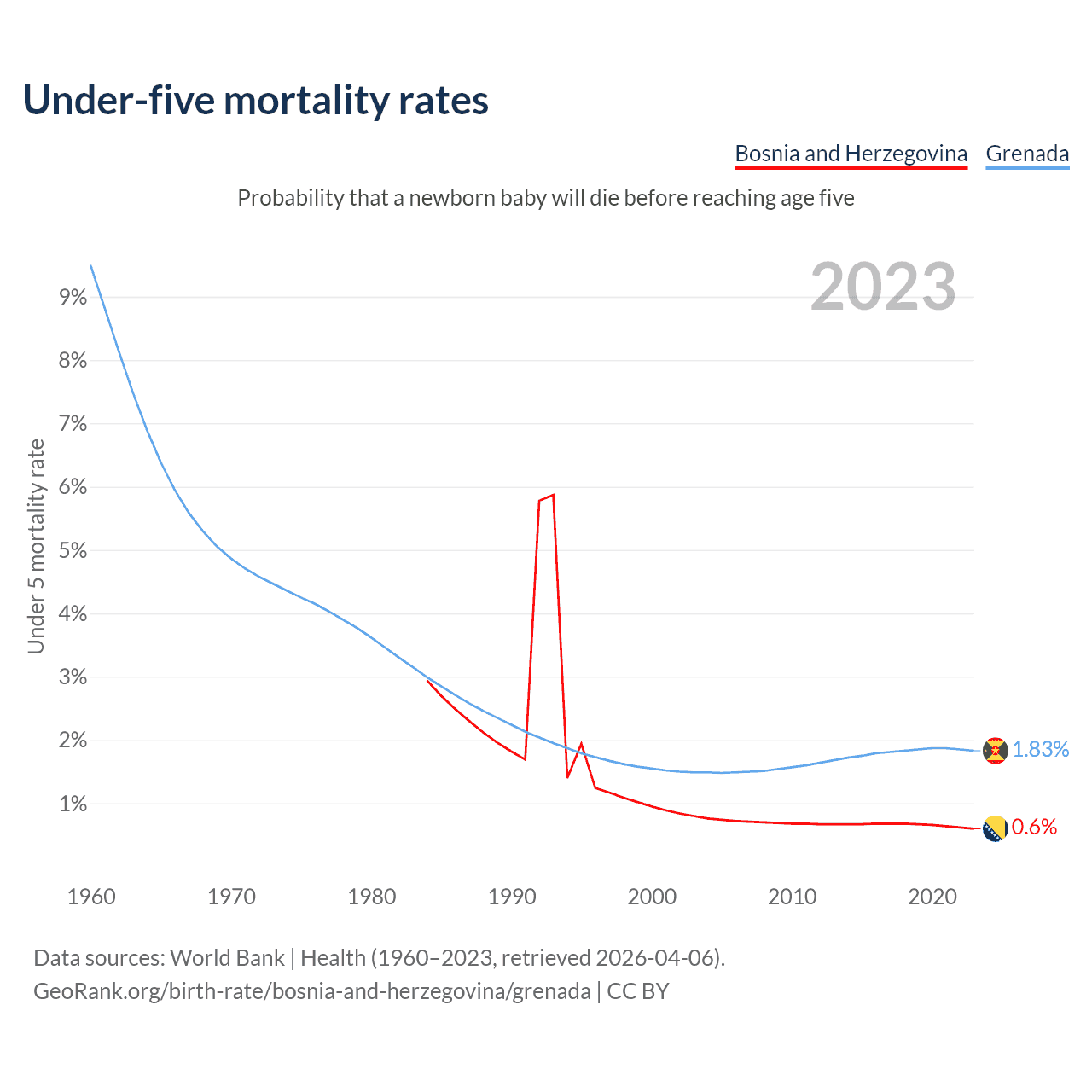 The chance that a newborn baby will die before reaching age five is 0.6% in Bosnia and Herzegovina and 1.83% in Grenada. Above is a chart with historical data on under-five mortality rates.